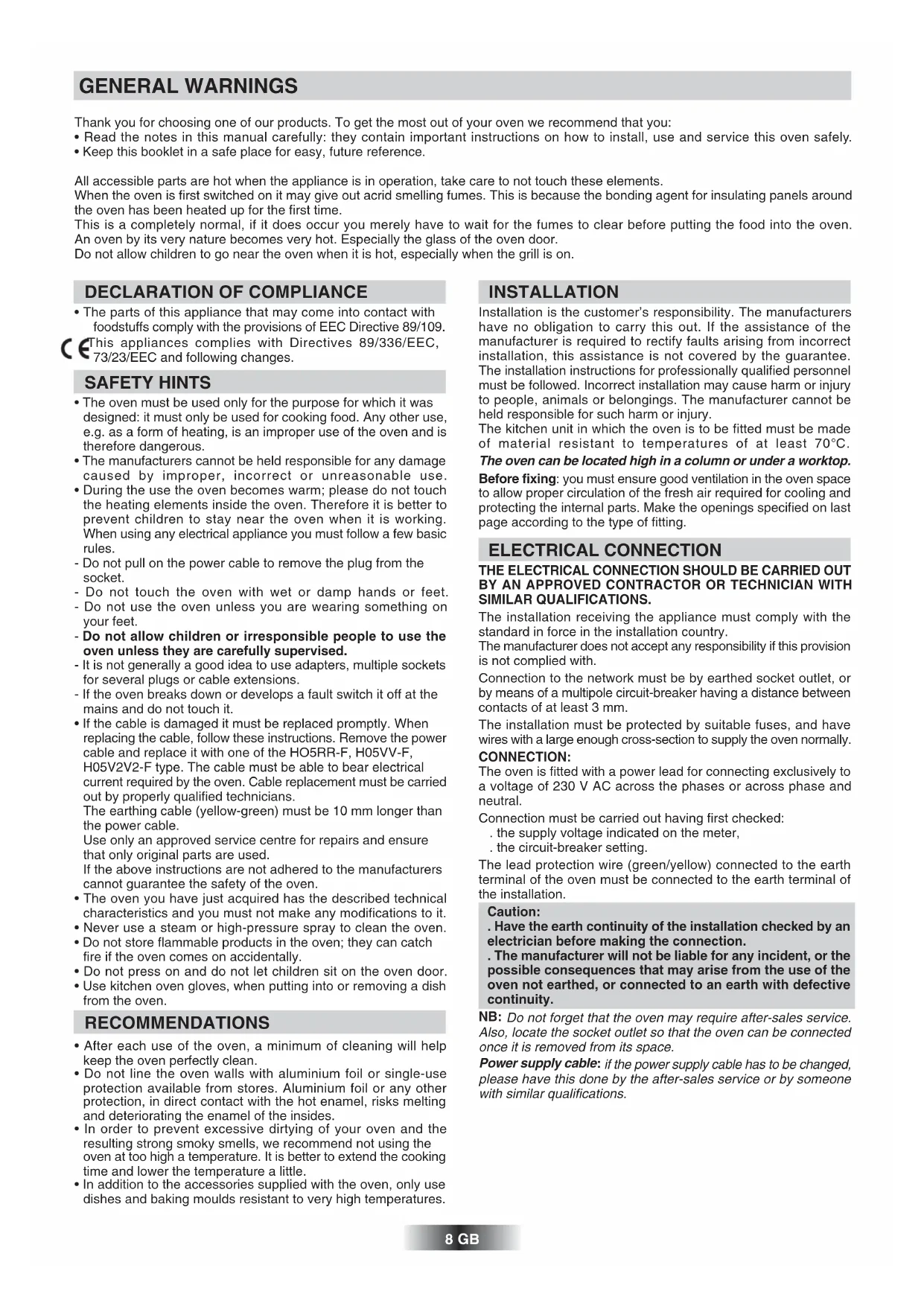 ELECTRICAL CONNECTION THE ELECTRICAL CONNECTION SHOULD BE CARRIED OUT BY AN APPROVED CONTRACTOR OR TECHNICIAN WITH SIMILAR QUALIFICATIONS.