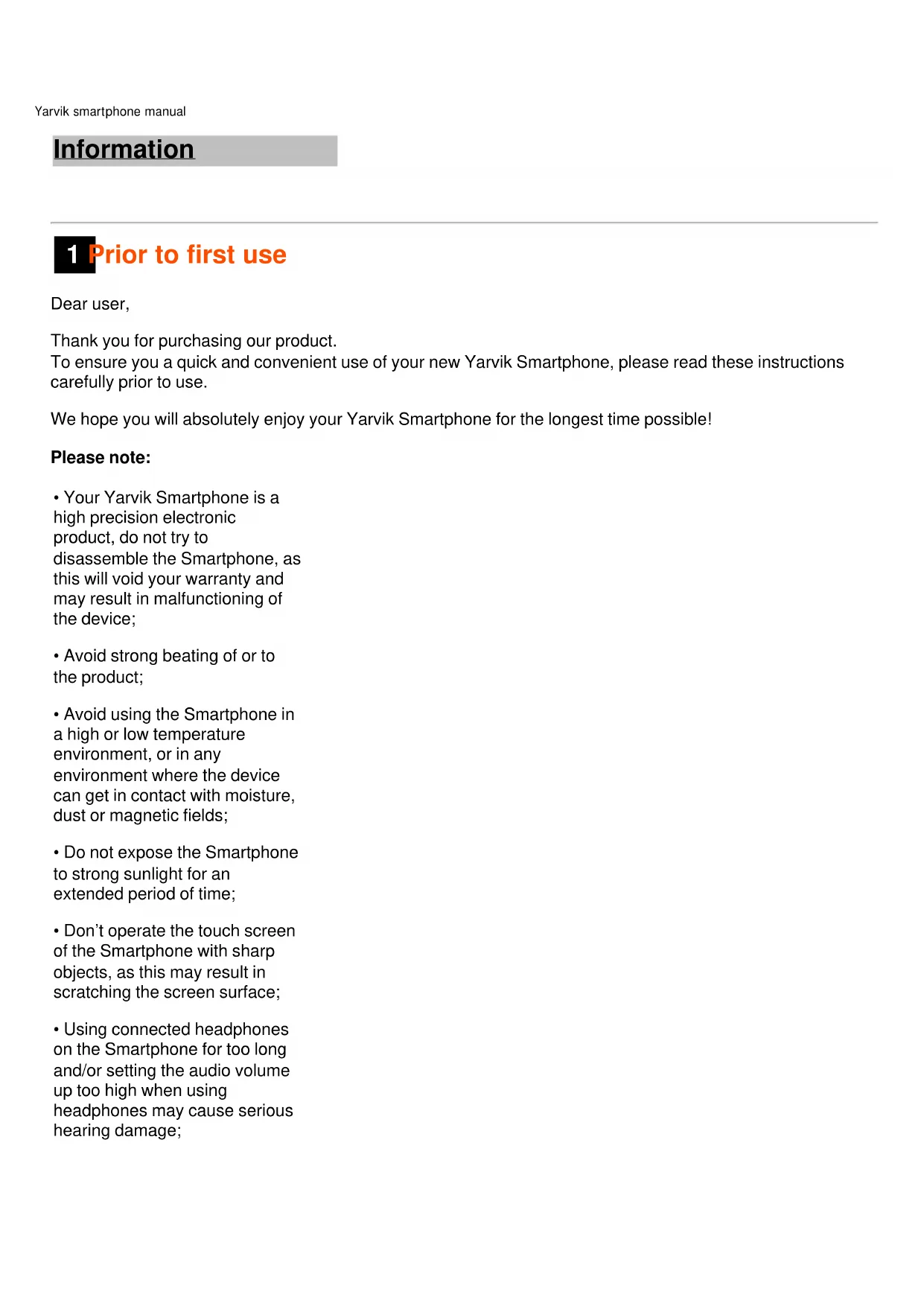 1 Prior to first use Dear user, Thank you for purchasing our product. To ensure you a quick and convenient use of your new Yarvik Smartphone, please read these instructions carefully prior to use. We hope you will absolutely enjoy your Yarvik Smartphone for the longest time possible! Please note: