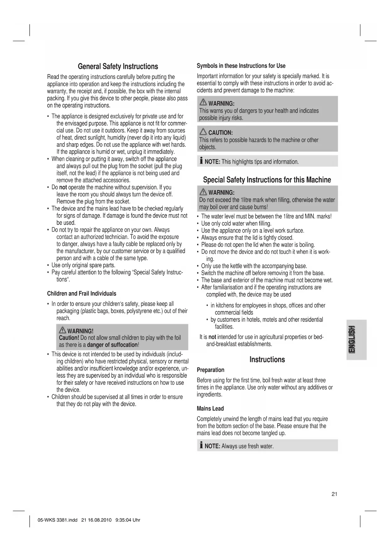 - Children should be supervised at all times in order to ensure that they do not play with the device. 05-WKS 3381.indd 20 16.08.2010 9:35:04 Uhr21 ENGLISH General Safety Instructions Read the operating instructions carefully before putting the appliance into operation and keep the instructions including the warranty, the receipt and, if possible, the box with the internal packing. If you give this device to other people, please also pass on the operating instructions.
