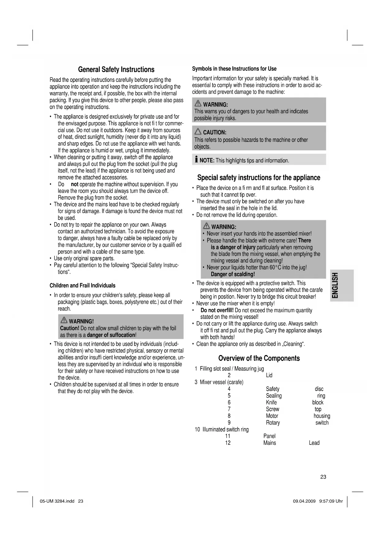 - Device is not working. Remedy: Check the mains connection. Check the position of the rotary switch. Other possible causes: The device is fi tted with a safety switch. This prevents the motor from starting up unintentionally. Remedy: Check that the mixer vessel and safety disc are fi rmly installed. Noise development The sound pressure level in the ear of an operator (LpA) was measured according to DIN EN ISO 3744. Sound pressure level detected: 82 dB(A) (no limit) Technical Data Model: ..............................................................................UM 3284 Power supply: .............................................220-240 V~, 50/60 Hz Power consumption: ............................................................ 500 W Protection class: ........................................................................... Ι Short-term operation: ...........................................................1 Min. Filling quantity: ........................................................... 0,5-1,5 Litre Net weight: ...........................................................................3,1 kg This device has been tested according to all relevant current CE guidelines, such as electromagnetic compatibility and low voltage directives, and has been constructed in accordance with the latest safety regulations. Subject to technical changes without prior notice! Meaning of the “Dustbin” Symbol Protect our environment: do not dispose of electrical equipment in the domestic waste. Please return any electrical equipment that you will no longer use to the collection points provided for their disposal. This helps avoid the potential effects of incorrect disposal on the environment and human health. This will contribute to the recycling and other forms of reutilisa- tion of electrical and electronic equipment. Information concerning where the equipment can be disposed of can be obtained from your local authority. 05-UM 3284.indd 2505-UM 3284.indd 25 09.04.2009 9:57:11 Uhr09.04.2009 9:57:11 Uhr26