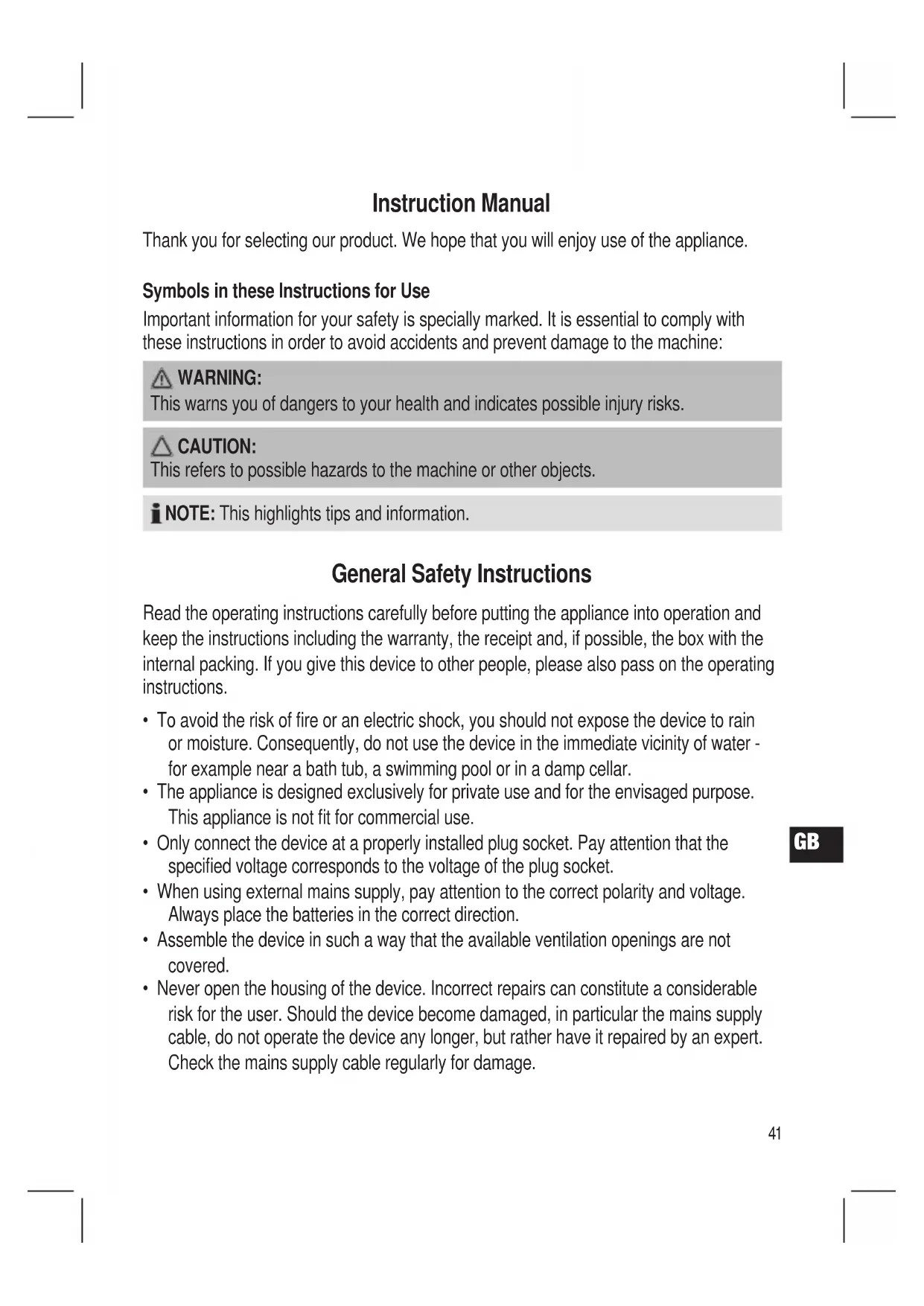 • For safety reasons a broken or damaged mains lead may only be replaced by an