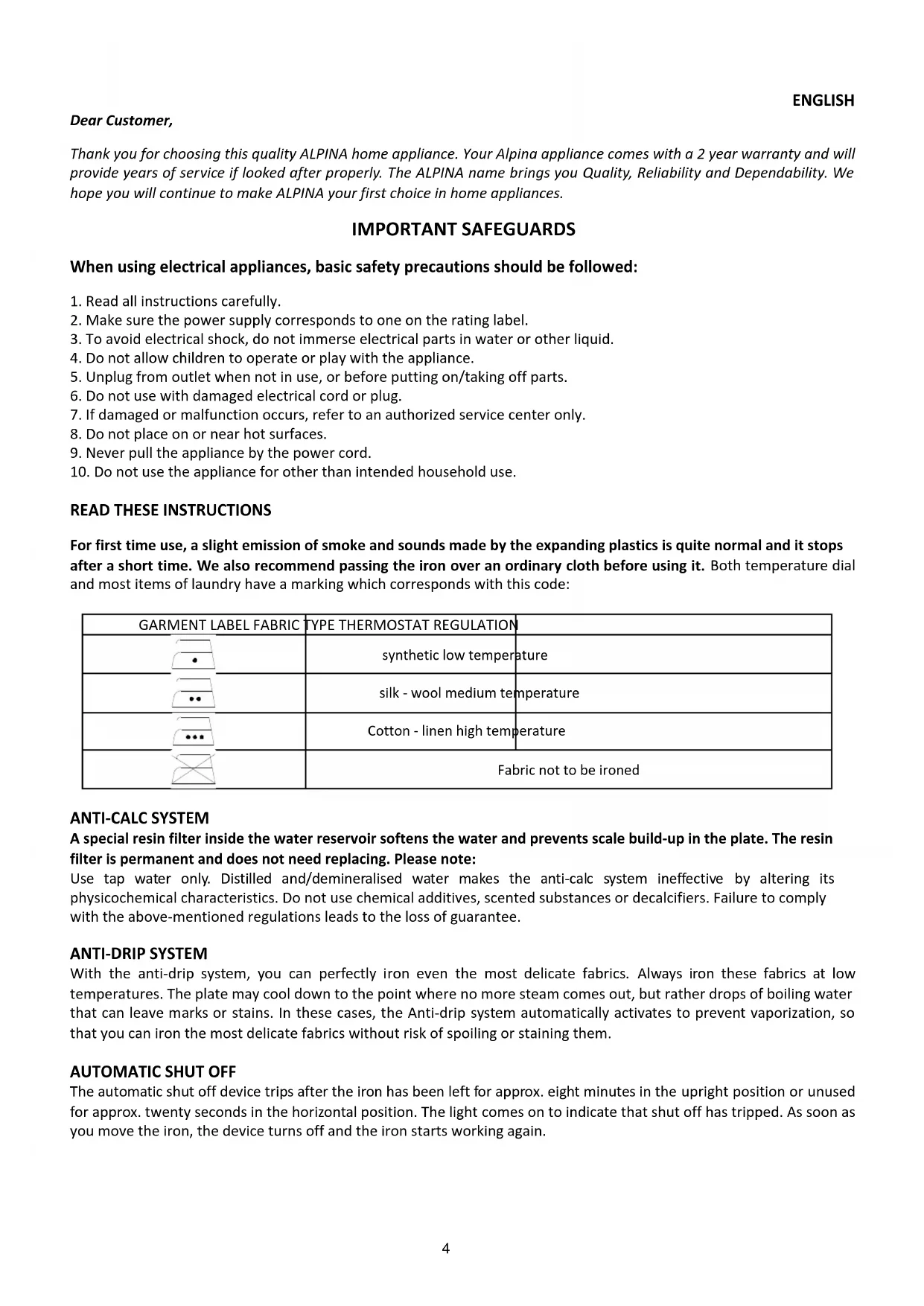 3ENGLISH Dear Customer, Thank you for choosing this quality ALPINA home appliance. Your Alpina appliance comes with a 2 year warranty and will provide years of service if looked after properly. The ALPINA name brings you Quality, Reliability and Dependability. We hope you will continue to make ALPINA your first choice in home appliances. IMPORTANT SAFEGUARDS When using electrical appliances, basic safety precautions should be followed:
