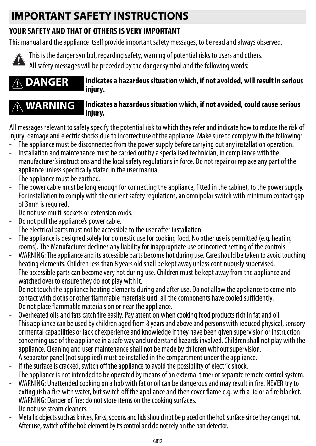 YOUR SAFETY AND THAT OF OTHERS IS VERY IMPORTANT This manual and the appliance itself provide important safety messages, to be read and always observed. This is the danger symbol, regarding safety, warning of potential risks to users and others. All safety messages will be preceded by the danger symbol and the following words: DANGER Indicates a hazardous situation which, if not avoided, will result in serious injury. WARNING Indicates a hazardous situation which, if not avoided, could cause serious injury. All messages relevant to safety specify the potential risk to which they refer and indicate how to reduce the risk of injury, damage and electric shocks due to incorrect use of the appliance. Make sure to comply with the following: - The appliance must be disconnected from the power supply before carrying out any installation operation. - Installation and maintenance must be carried out by a specialised technician, in compliance with the manufacturer’s instructions and the local safety regulations in force. Do not repair or replace any part of the appliance unless specifically stated in the user manual. - The appliance must be earthed. - The power cable must be long enough for connecting the appliance, fitted in the cabinet, to the power supply. - For installation to comply with the current safety regulations, an omnipolar switch with minimum contact gap of 3mm is required. - Do not use multi-sockets or extension cords. - Do not pull the appliance’s power cable. - The electrical parts must not be accessible to the user after installation. - The appliance is designed solely for domestic use for cooking food. No other use is permitted (e.g. heating rooms). The Manufacturer declines any liability for inappropriate use or incorrect setting of the controls. - WARNING: The appliance and its accessible parts become hot during use. Care should be taken to avoid touching heating elements. Children less than 8 years old shall be kept away unless continuously supervised. - The accessible parts can become very hot during use. Children must be kept away from the appliance and watched over to ensure they do not play with it. - Do not touch the appliance heating elements during and after use. Do not allow the appliance to come into contact with cloths or other flammable materials until all the components have cooled sufficiently. - Do not place flammable materials on or near the appliance. - Overheated oils and fats catch fire easily. Pay attention when cooking food products rich in fat and oil. - This appliance can be used by children aged from 8 years and above and persons with reduced physical, sensory or mental capabilities or lack of experience and knowledge if they have been given supervision or instruction concerning use of the appliance in a safe way and understand hazards involved. Children shall not play with the appliance. Cleaning and user maintenance shall not be made by children without supervision. - A separator panel (not supplied) must be installed in the compartment under the appliance. - If the surface is cracked, switch off the appliance to avoid the possibility of electric shock. - The appliance is not intended to be operated by means of an external timer or separate remote control system. - WARNING: Unattended cooking on a hob with fat or oil can be dangerous and may result in fire. NEVER try to extinguish a fire with water, but switch off the appliance and then cover flame e.g. with a lid or a fire blanket.