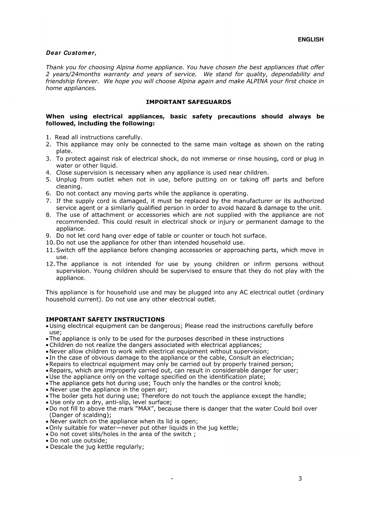 Dear Customer, Thank you for choosing Alpina home appliance. You have chosen the best appliances that offer 2 years/24months warranty and years of service. We stand for quality, dependability and friendship forever. We hope you will choose Alpina again and make ALPINA your first choice in home appliances. IMPORTANT SAFEGUARDS When using electrical appliances, basic safety precautions should always be followed, including the following: