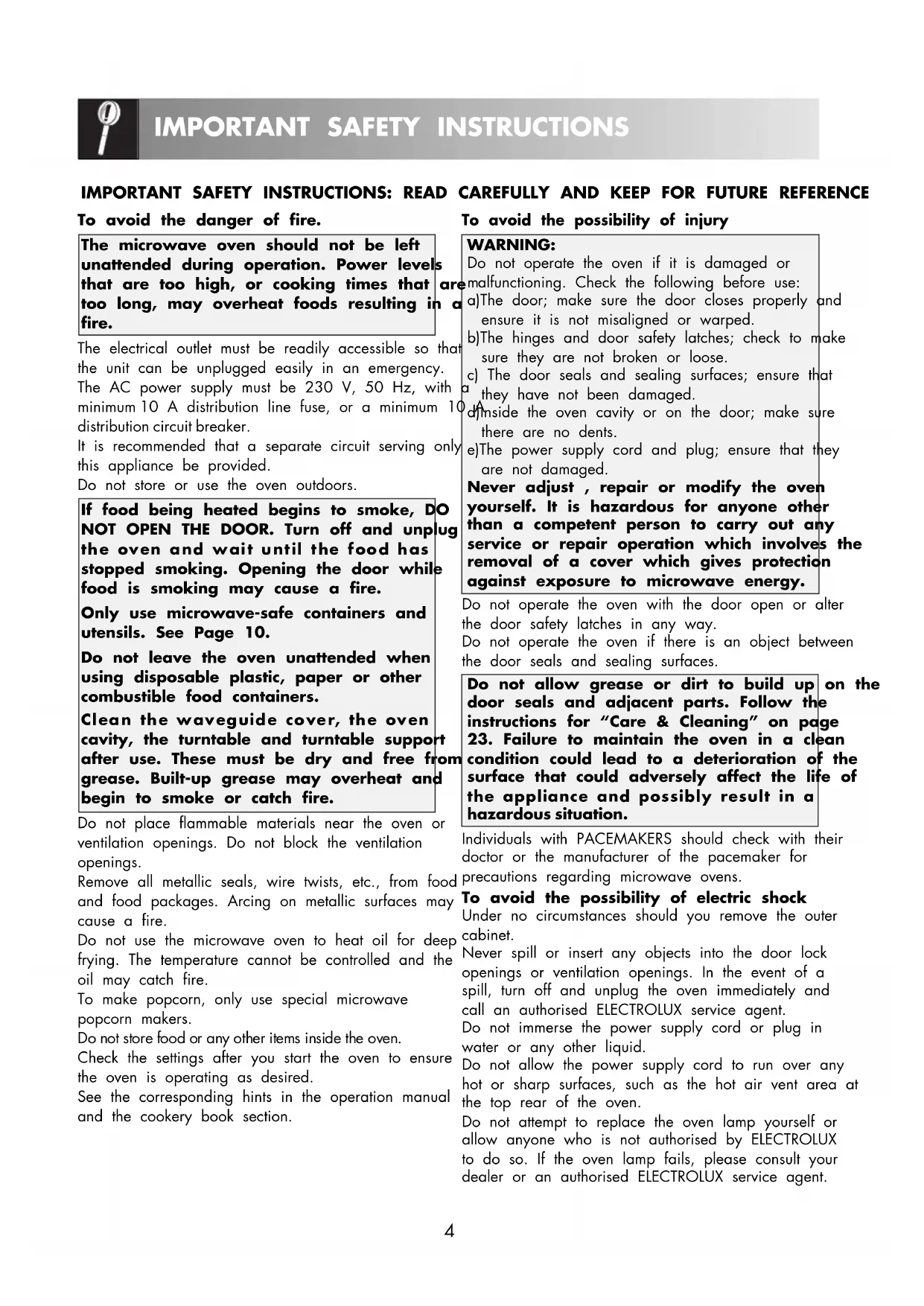 If the power supply cord of this appliance is damaged, it must be replaced with a special cord. The exchange must be made by an authorised ELECTROLUX service agent.