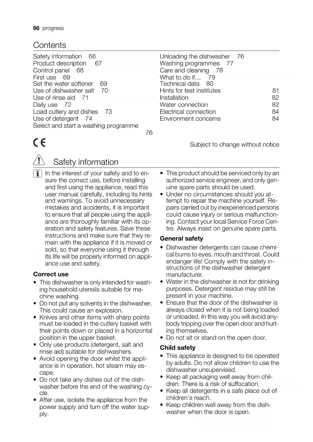 Unloading the dishwasher 76 Washing programmes 77 Care and cleaning 78 What to do if… 79 Technical data 80 Hints for test institutes 81 Installation 82 Water connection 82 Electrical connection 84 Environment concerns 84 Subject to change without notice Safety information In the interest of your safety and to en- sure the correct use, before installing and first using the appliance, read this user manual carefully, including its hints and warnings. To avoid unnecessary mistakes and accidents, it is important to ensure that all people using the appli- ance are thoroughly familiar with its op- eration and safety features. Save these instructions and make sure that they re- main with the appliance if it is moved or sold, so that everyone using it through its life will be properly informed on appli- ance use and safety. Correct use