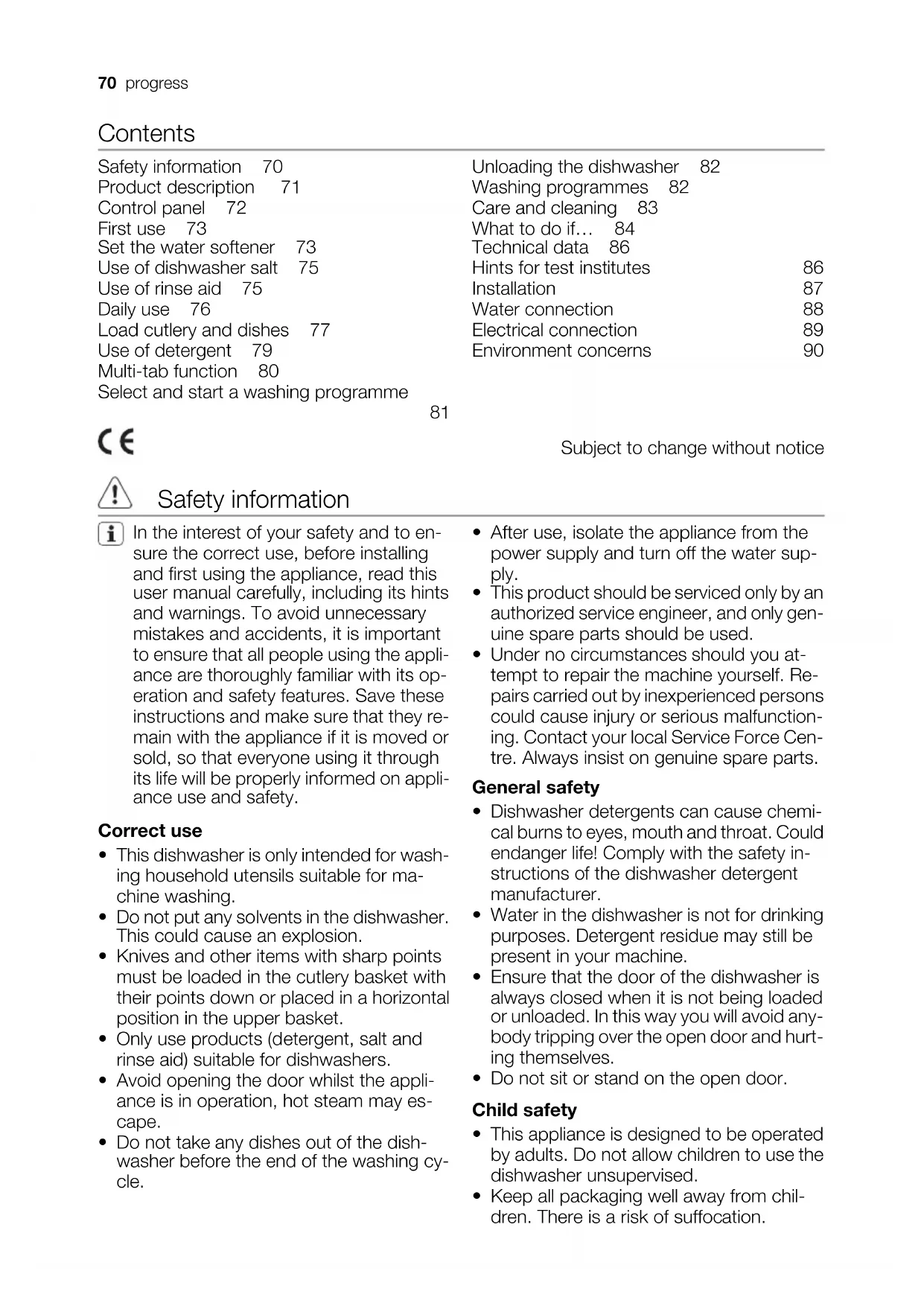 Unloading the dishwasher 82 Washing programmes 82 Care and cleaning 83 What to do if… 84 Technical data 86 Hints for test institutes 86 Installation 87 Water connection 88 Electrical connection 89 Environment concerns 90 Subject to change without notice Safety information In the interest of your safety and to en- sure the correct use, before installing and first using the appliance, read this user manual carefully, including its hints and warnings. To avoid unnecessary mistakes and accidents, it is important to ensure that all people using the appli- ance are thoroughly familiar with its op- eration and safety features. Save these instructions and make sure that they re- main with the appliance if it is moved or sold, so that everyone using it through its life will be properly informed on appli- ance use and safety. Correct use