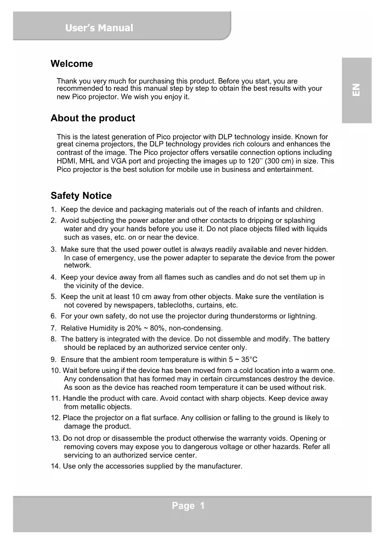 HDMI, MHL and VGA port and projecting the images up to 120’’ (300 cm) in size. This