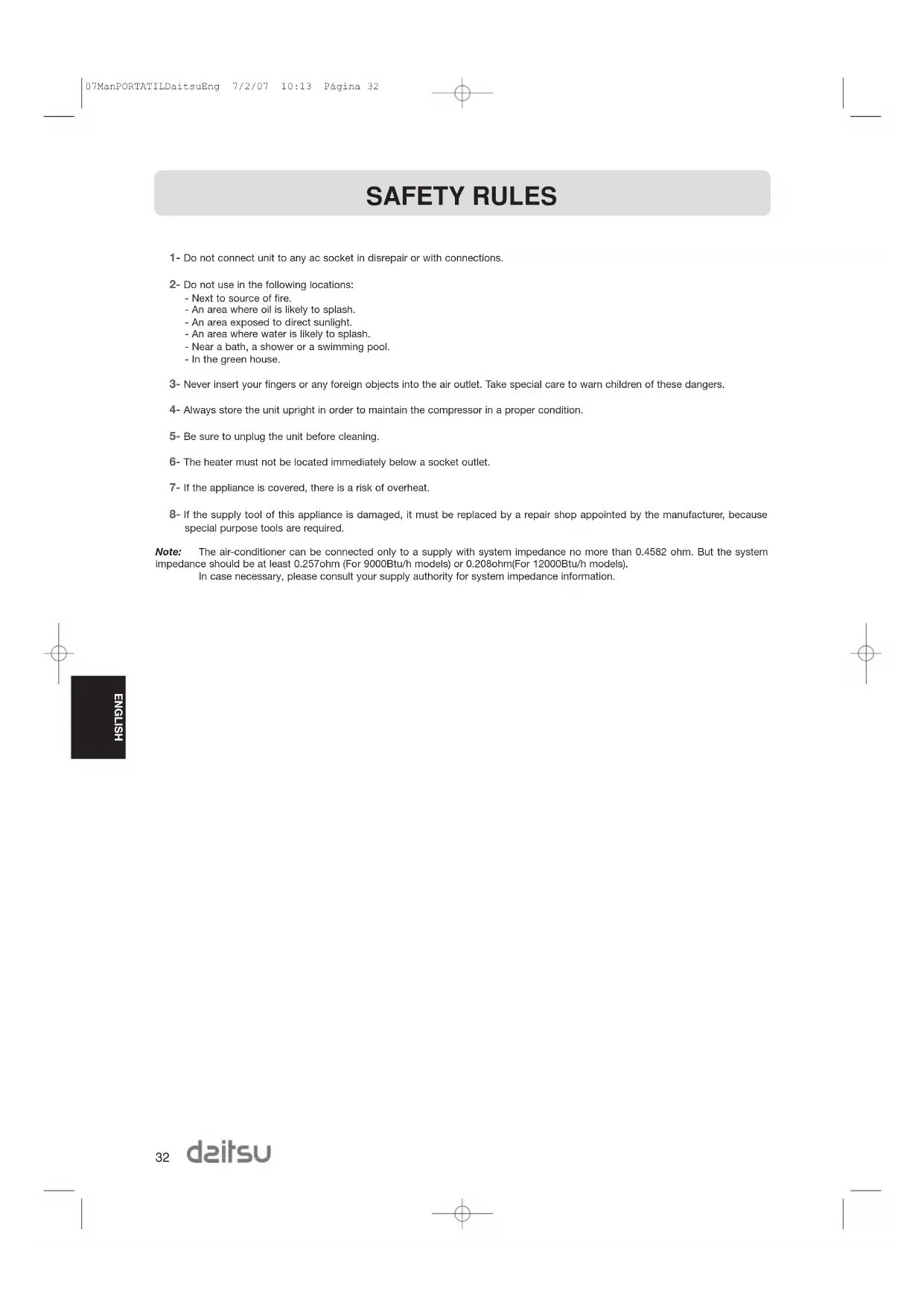 8- If the supply tool of this appliance is damaged, it must be replaced by a repair shop appointed by the manufacturer, because special purpose tools are required. Note: The air-conditioner can be connected only to a supply with system impedance no more than 0.4582 ohm. But the system impedance should be at least 0.257ohm (For 9000Btu/h models) or 0.208ohm(For 12000Btu/h models). In case necessary, please consult your supply authority for system impedance information. SAFETY RULES 07ManPORTATILDaitsuEng 7/2/07 10:13 Página 32ENGLISH
