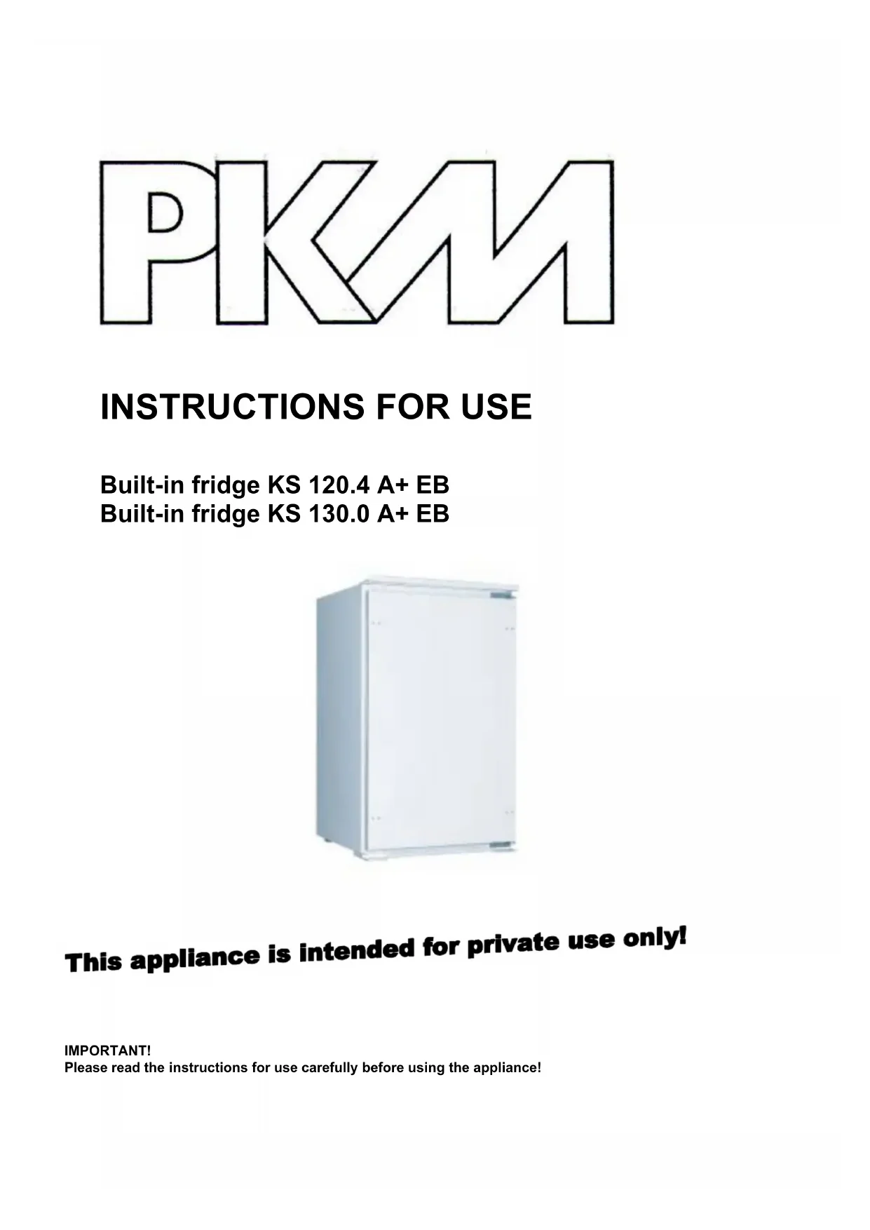 Built-in fridge KS 120.4 A+ EB Built-in fridge KS 130.0 A+ EB IMPORTANT! Please read the instructions for use carefully before using the appliance!Table of contents: Page 1 Contents Page 2 Environmental aspects Page 3 Important notes and information Page 4 Technical data built-in fridge KS 120.4A+ EB Page 5 Technical data built-in fridge KS 130.0A+ EB Page 6 Installation in corners Page 9 Temperature control Defrosting/Cleaning Page 10 Reversing doors Reversing freezer door (only for KS 120.4A+ EB) Page 11 Troubleshooting Page 12 Important supplement to instructions for useEnvironmental aspects PLEASE SUPPORT OUR ENVIRONMENT BY DISPOSING OF YOUR OLD APPLIANCE AND PACKAGING IN ACCORDANCE WITH STATUTORY REQUIREMENTS. Old appliances are not unusable waste. Many valuable raw materials can be recovered by environmentally-friendly disposal. Before disposing of your old appliance, it must be rendered unusable! Pull the plug out of the socket, cut the connecting lead off and dispose of the plug together with the remaining lead in an environmentally-friendly manner! Any appliances with snap-catch or lock, e.g. dryers, washing machines, etc., should also be rendered unusable prior to disposal, this will prevent small children playing with these and endangering their lives by locking themselves in! Refrigerators contain refrigerant and gases in their cooling systems and insulation, which must be disposed of in a proper manner. It is important not to damage the cooling fins and tubes prior to proper disposal (refrigerant spillage poses a fire risk). Packaging materials are not toys for children! The wrapping, boxes and insulating materials can cause suffocation! The specified valuable materials are environmentally compatible and recyclable. It also applies here that packaging must be disposed of in an environmentally- friendly manner. Further information is available from your retailer or appropriate authorities.Important notes and information The fridge is intended for domestic use and complies with current requirements and is CFC-free. This fridge is a climatic class N appliance and is suitable for domestic use and operates reliably at ambient temperatures of 16ÇC-32ÇC. This appliance contains environmentally-friendly refrigerant Isobutan R600a. This natural gas is environmentally-friendly, however flammable. It is therefore ABSOLUTELY essential that no refrigerating system parts are damaged during operation or transport. If part of the system should be damaged, the appliance should be kept away from fire, naked flames and sparks and the customer service centre should be notified. These instructions for use should be read carefully before using the appliance in order to utilise its full potential. Keep children away from the appliance! The mains plug must be disconnected or the appliance isolated from the supply before any work is carried out on the same. The manufacturer of the product(s) shown on the front page of these instructions for use herewith declares on his sole responsibility that the appliance(s) so far as provided with the CE mark on the appliance nameplate, to which this declaration refers, complies with the pertinent health and safety requirements, applicable EC Directives and relevant documents, in particular the EC Declaration of Conformity correctly issued by the manufacturer or his authorisedPKM built-in fridge KS 120.4A+ EB Built-in fridge with 4 star freezer compartment (-18ÉC) climatic class N Net capacity: 120 litres Net capacity: 105 litres (of which 15 litres freezer compartment) Freezer capacity: 2 kg/24 h Energy class: A+ CFC-free (foam + refrigerant = 100 %) Refrigerant R600a/20 g Reversible doors, right or left Automatic defrost in freezer manual defrost in freezer Thermostat control 1 height adjustable glass shelf (unbreakable) 1 unbreakable glass shelf as cover for vegetable compartment 1 vegetable drawer Door shelves: 1x bottle rack, 2x universal shelves Interior light Installed load: 90 W Operating voltage: 220-240 V ~50 Hz Sound level: about 39 dB(A) Dimensions: 88 x 54 x 54 (H x W x D in cm) Packaging dimensions: 94 x 57 x 57 (H xW x D in cm) Net weight: 31 kg Gross weight: 34 kgPKM built-in fridge KS 130.0A+ EB Built-in fridge (climatic class N) Net capacity: 130 litres Energy class: A+ CFC-free (foam + refrigerant = 100%) Refrigerant R600a/15 g Reversible doors, right or left Automatic defrost Thermostat control 2 height adjustable glass shelves (unbreakable) 1 unbreakable glass shelf as cover for vegetable compartment 1 vegetable drawer Door shelves: 1x bottle rack, 2x universal shelves Interior light Installed load: 90 W Operating voltage: 220-240 V ~50 Hz Sound level: about 39 dB(A) Dimensions: 88 x 54 x 54 (H x W x D in cm) Packaging dimensions: 94 x 57 x 57 (H x W x D in cm) Net weight: 31 kg Gross weight: 34 kg 5Installation Before connecting the appliance, a check must be made to ensure that the appliance and mains leads are not damaged through transport. The plugs of the mains leads must be connected only to a properly earthed socket. Do not use any extension leads or trailing sockets for 230V/50 Hz mains operation! Damaged mains leads must be replaced only by a qualified person. Refer other work and repairs ONLY to an authorised TechnikService24-specialist. Ensure that the fridge stands horizontal on a firm surface to ensure perfect operation. A check can be made by placing a spirit level on top of the appliance. The fridge should be installed in a dry and well ventilated room. The appliance is not suitable for outdoor use. The appliance must be protected from direct sunlight and should not be installed near to heat sources (oven, radiators, etc.). To avoid a risk of fire, do not place any electric heating appliances on the fridge. Do not place any kettles on the fridge as spilt boiling liquids can damage the electrical insulation. Installation in corners Push the appliance carefully into the corner and ensure that the fridge stands correctly aligne
