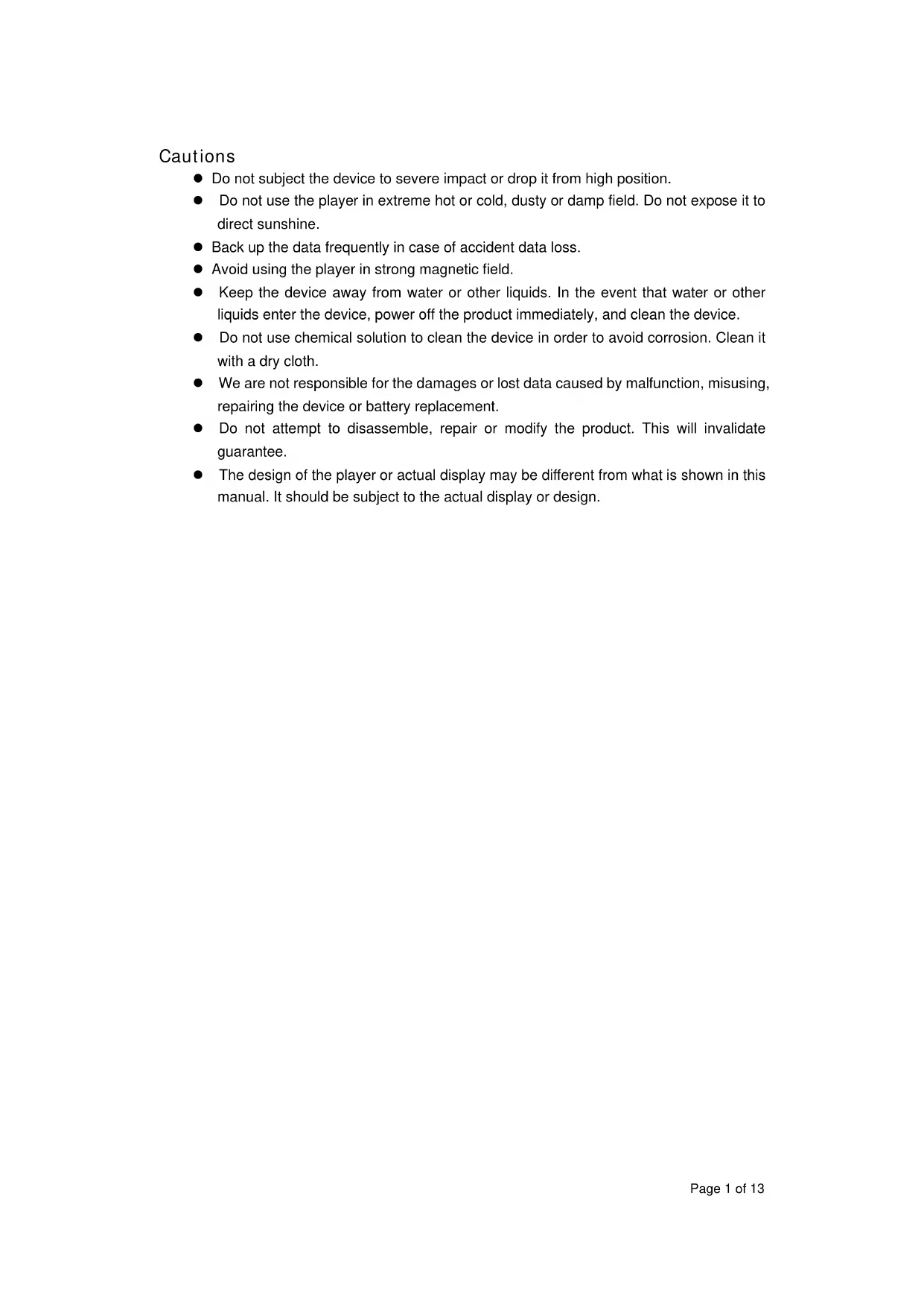- The design of the player or actual display may be different from what is shown in this manual. It should be subject to the actual display or design.