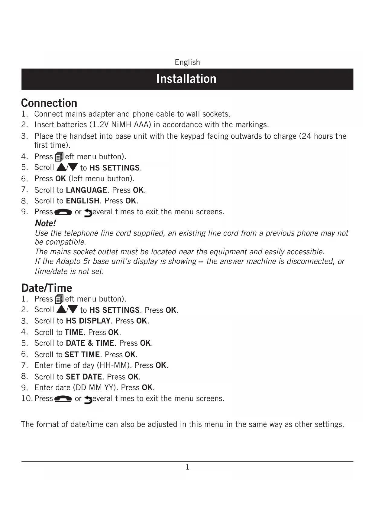 - Connect mains adapter and phone cable to wall sockets.