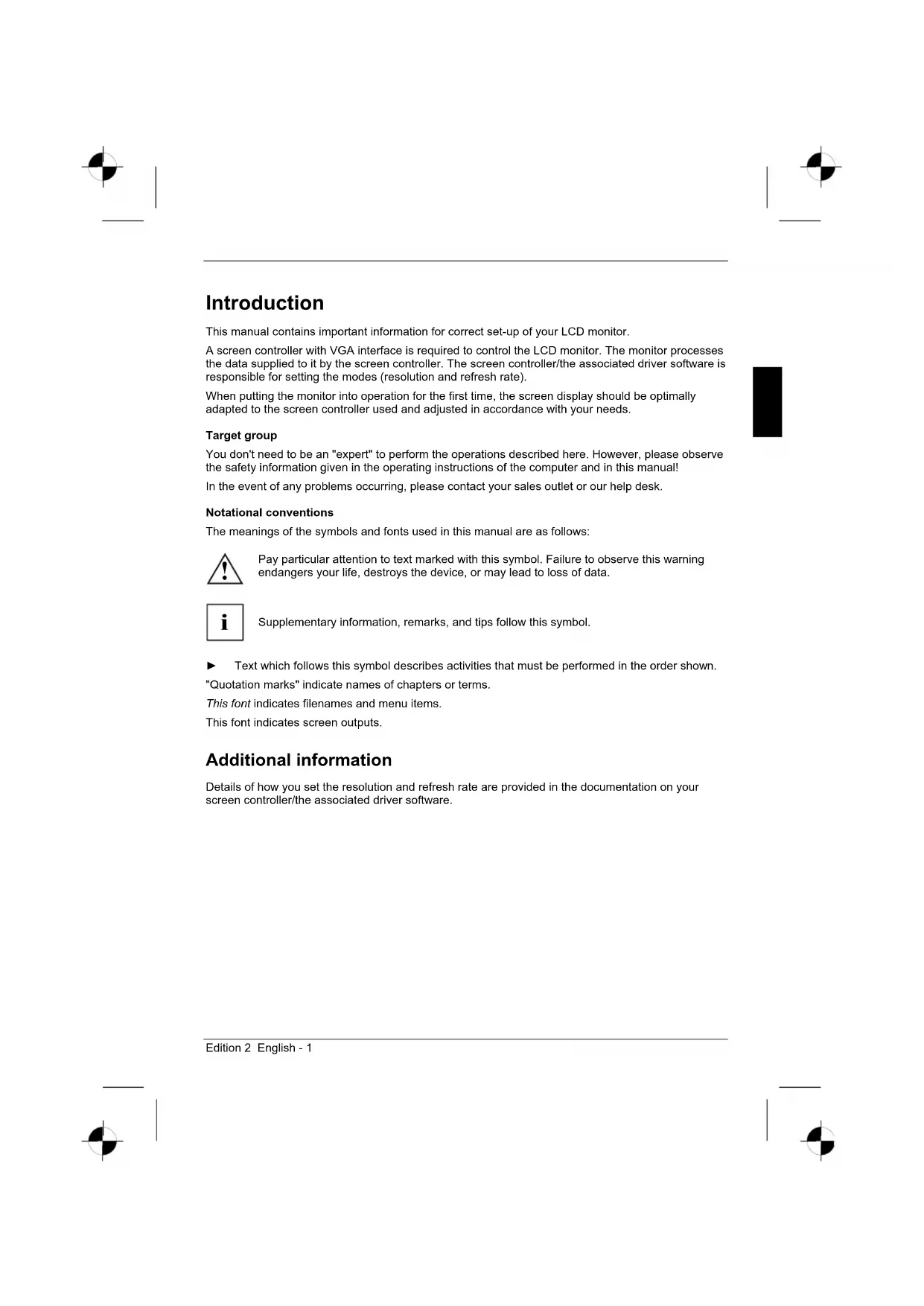 Ɣ To ensure sufficient ventilation, the intake and exhaust air openings of the monitor must never
