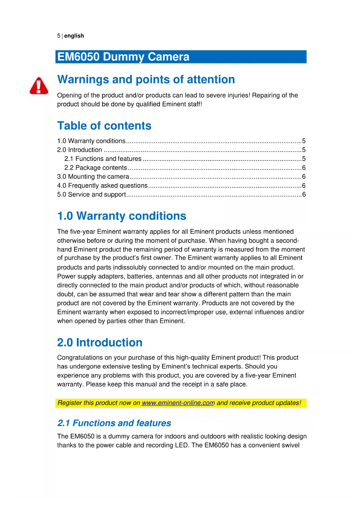 The five-year Eminent warranty applies for all Eminent products unless mentioned otherwise before or during the moment of purchase. When having bought a second- hand Eminent product the remaining period of warranty is measured from the moment of purchase by the product’s first owner. The Eminent warranty applies to all Eminent products and parts indissolubly connected to and/or mounted on the main product. Power supply adapters, batteries, antennas and all other products not integrated in or directly connected to the main product and/or products of which, without reasonable doubt, can be assumed that wear and tear show a different pattern than the main product are not covered by the Eminent warranty. Products are not covered by the Eminent warranty when exposed to incorrect/improper use, external influences and/or when opened by parties other than Eminent.