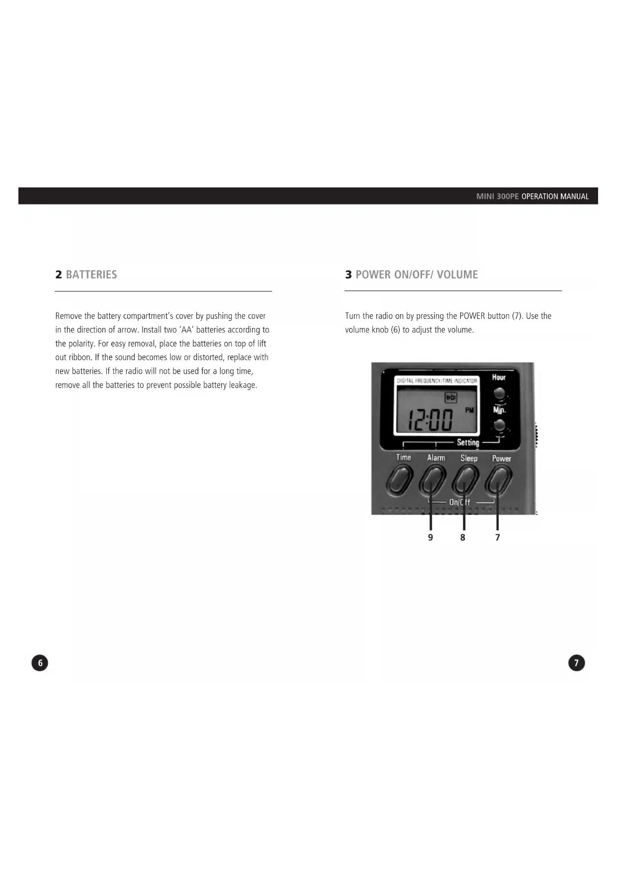 2 BATTERIES Remove the battery compartment’s cover by pushing the cover in the direction of arrow. Install two ‘AA’ batteries according to the polarity. For easy removal, place the batteries on top of lift out ribbon. If the sound becomes low or distorted, replace with new batteries. If the radio will not be used for a long time, remove all the batteries to prevent possible battery leakage.MINI 300PE OPERATION MANUAL