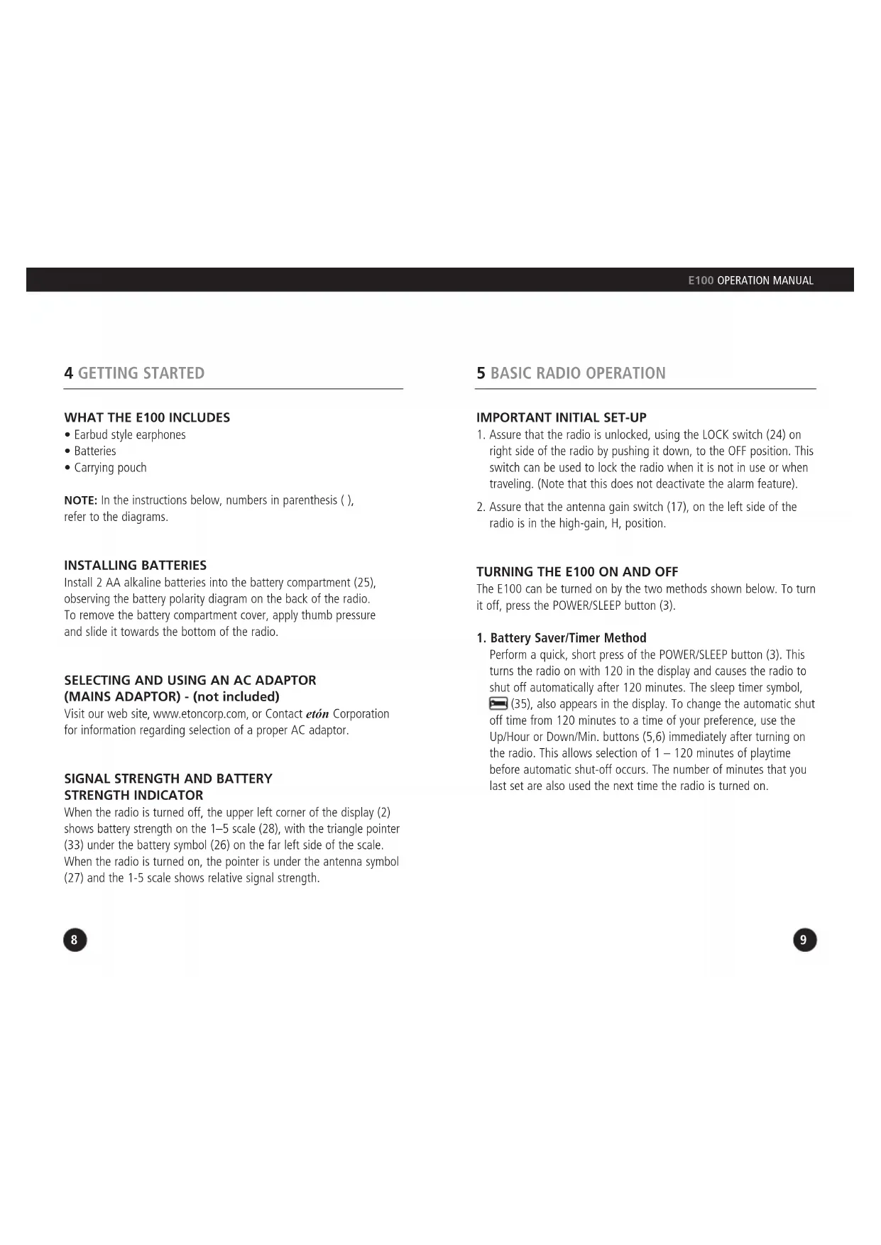 Thank you for purchasing the E100 AM/FM/Shortwave Radio. This radio has been designed and manufactured to high quality standards, and will provide reliable operation for many years. Please carefully read the Owner’s Manual in order to take advantage of the many interesting features of the E100. 1 INTRODUCTION7