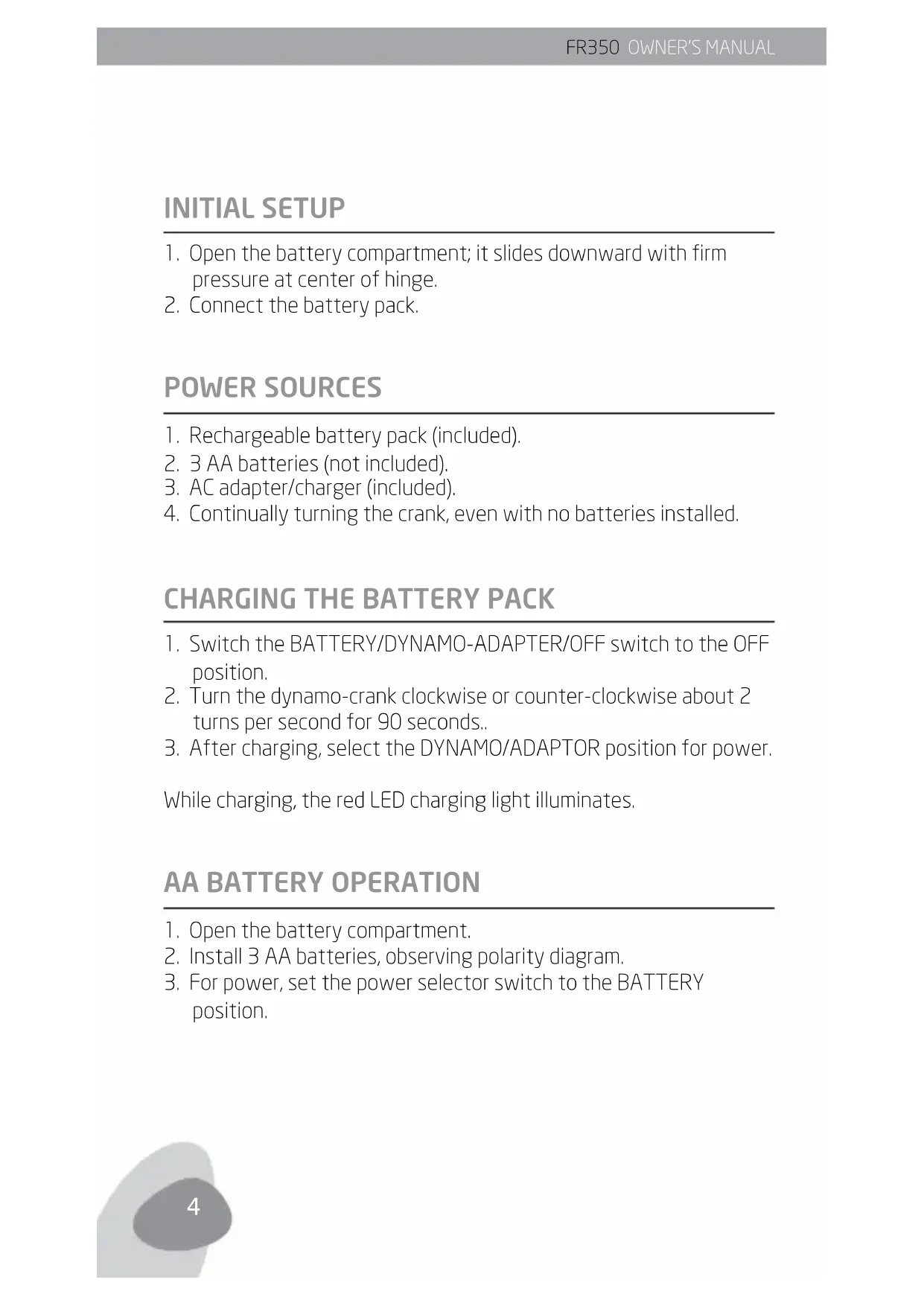TUNING-IN STATIONS SHORTWAVE RECEPTIONS FR350 OWNER’S MANUALWORLD RADIO TV HANDBOOK Published in the USA by Watson-Guptill Publications, 770 Broadway, 7th Floor, New York, NY 10003-9595 USA. www. watsonguptill.com. Set the LIGHT/OFF/FLASH switch to the FLASH or LIGHT position. Set the SIREN/OFF/ALERT switch to the SIREN position. Flip open the socket cover and plug in earphones (not included). Ni-MH; 3.6 volt DC; 600 mAh. Output 4.5 volt DC; negative polarity; 100 milliampere; plug tip outer diameter 3.4mm, inner diameter 1.3mm. AC adapter use automati- cally charges the rechargeable battery pack. Only charge the battery pack with a 100 milliampere AC adapter. If an AC adapter rated greater than 100 milliampere is used, disconnect the rechargeable battery pack.