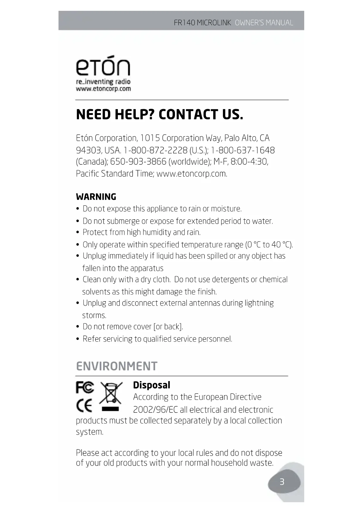 NEED HELP? CONTACT US. Etón Corporation, 1015 Corporation Way, Palo Alto, CA 94303, USA. 1-800-872-2228 (U.S.); 1-800-637-1648 (Canada); 650-903-3866 (worldwide); M-F, 8:00-4:30, Pacic Standard Time; www.etoncorp.com. WARNING