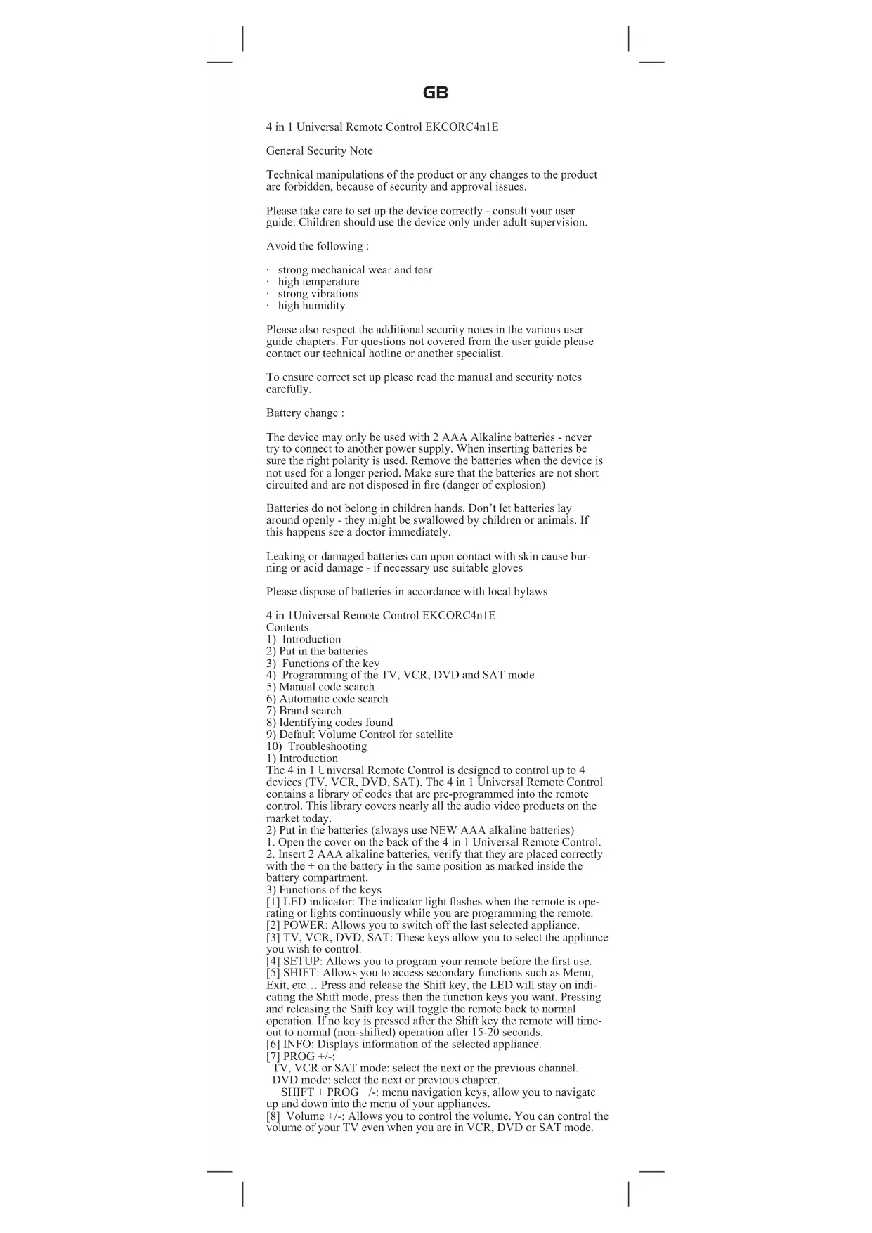 The 4 in 1 Universal Remote Control is designed to control up to 4 devices (TV, VCR, DVD, SAT). The 4 in 1 Universal Remote Control contains a library of codes that are pre-programmed into the remote control. This library covers nearly all the audio video products on the markettoday. 2)Putinthebatteries(alwaysuseNEWAAAalkalinebatteries) 1.Openthecoveronthebackofthe4in1UniversalRemoteControl. 2.Insert2AAAalkalinebatteries,verifythattheyareplacedcorrectly withthe+onthebatteryinthesamepositionasmarkedinsidethe battery compartment. 3)Functionsofthekeys [1]LEDindicator:Theindicatorlightasheswhentheremoteisope- rating or lights continuously while you are programming the remote. [2] POWER: Allows you to switch off the last selected appliance. [3]TV,VCR,DVD,SAT:Thesekeysallowyoutoselecttheappliance you wish to control. [4]SETUP:Allowsyoutoprogramyourremotebeforetherstuse. [5] SHIFT: Allows you to access secondary functions such as Menu, Exit,etc…PressandreleasetheShiftkey,theLEDwillstayonindi- catingtheShiftmode,pressthenthefunctionkeysyouwant.Pressing andreleasingtheShiftkeywilltoggletheremotebacktonormal operation.IfnokeyispressedaftertheShiftkeytheremotewilltime- out to normal (non-shifted) operation after 15-20 seconds. [6] INFO: Displays information of the selected appliance. [7]PROG+/-: TV, VCR or SAT mode: select the next or the previous channel. DVD mode: select the next or previous chapter. SHIFT+PROG+/-:menunavigationkeys,allowyoutonavigate up and down into the menu of your appliances. [8]Volume+/-:Allowsyoutocontrolthevolume.Youcancontrolthe volume of your TV even when you are in VCR, DVD or SAT mode. GBNo need to select the TV mode. SHIFT+Volume+/-:menunavigationkeys,allowyoutonavigate left and right into the menu of your appliances. [9] Teletext MIX: Allows to mix the Teletext and the picture of the selected channel. [10]Mute:Allowsyoutoturnon/offthesound.Youcancontrolthe «Mute» function of your TV even when you are in VCR, DVD or SAT mode. No need to select the TV mode. SHIFT+Mute:OKkey,conrmstheselection. [11] Teletext OFF: TV mode: Stop Teletext. SHIFT+TeletextOFF:ExitMenu. [12] Teletext Hold: Stop page change in Teletext mode. [13]Numerickeys0-9:Workthesamewayasyouroriginalremote. [14] Teletext ON: TVmode:Start/stopTeletext. SHIFT+TeletextON:MenuON. [15] ENT: If you are in programming mode – automatic code search-youcanconrmthecodeofthedeviceyouwanttocontrol.In connectionwiththenumerickeys,thisbuttonallowsyouwithsome equipment to select directly channels higher than 9. [16]A/V:Selectionofanexternalsource(SCARTinput). [17] Play, FF, Stop, Rew, Pause: InVCR&DVDmode:Thesebuttonsworkthesamewayasin your original remotes. InTVmode:Fasttextfunction(colouredkeys). REC(record):Thiskeyworksthesamewayastheoneonyour originalremoteforyourVCR.Inordertoavoidamistakeyouhaveto pressthiskeytwicetoactivatethisfeature.