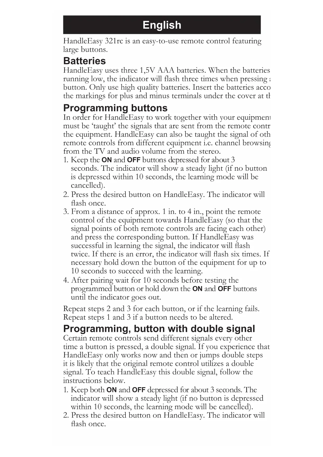 programmed button or hold down the ON and OFF buttons until the indicator goes out. Repeat steps 2 and 3 for each button, or if the learning fails. Repeat steps 1 and 3 if a button needs to be altered. Programming, button with double signal Certain remote controls send different signals every other time a button is pressed, a double signal. If you experience that HandleEasy only works now and then or jumps double steps it is likely that the original remote control utilizes a double signal. To teach HandleEasy this double signal, follow the instructions below.