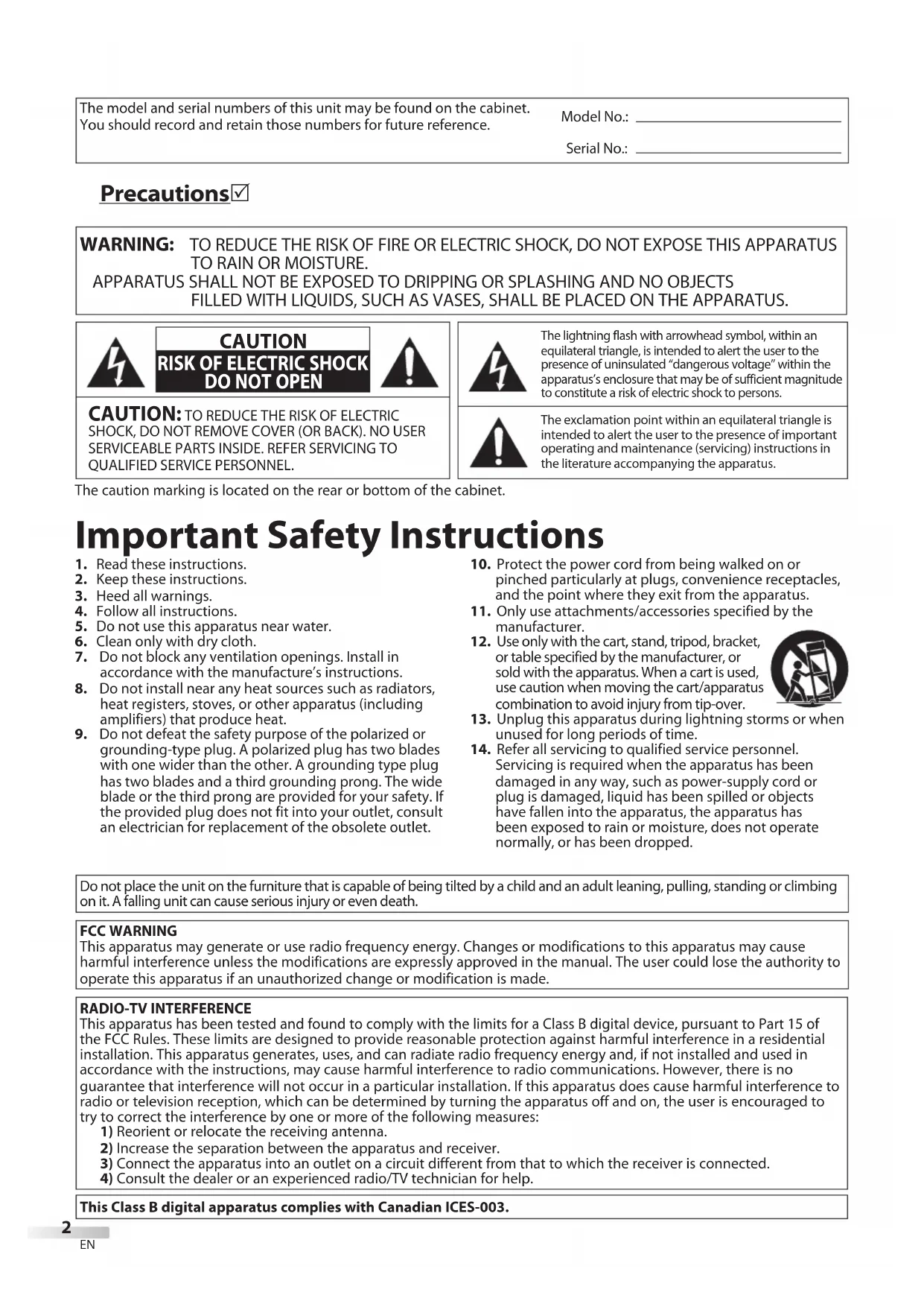4) Consult the dealer or an experienced radio/TV technician for help.This Class B digital apparatus complies with Canadian ICES-003.The model and serial numbers of this unit may be found on the cabinet.You should record and retain those numbers for future reference. Serial No.:Model No.:The caution marking is located on the rear or bottom of the cabinet.The exclamation point within an equilateral triangle is intended to alert the user to the presence of important operating and maintenance (servicing) instructions in the literature accompanying the apparatus.The lightning flash with arrowhead symbol, within an equilateral triangle, is intended to alert the user to the presence of uninsulated “dangerous voltage” within the apparatus’s enclosure that may be of sufficient magnitude to constitute a risk of electric shock to persons. CAUTION: TO REDUCE THE RISK OF ELECTRIC SHOCK, DO NOT REMOVE COVER (OR BACK). NO USER SERVICEABLE PARTS INSIDE. REFER SERVICING TO QUALIFIED SERVICE PERSONNEL. CAUTION