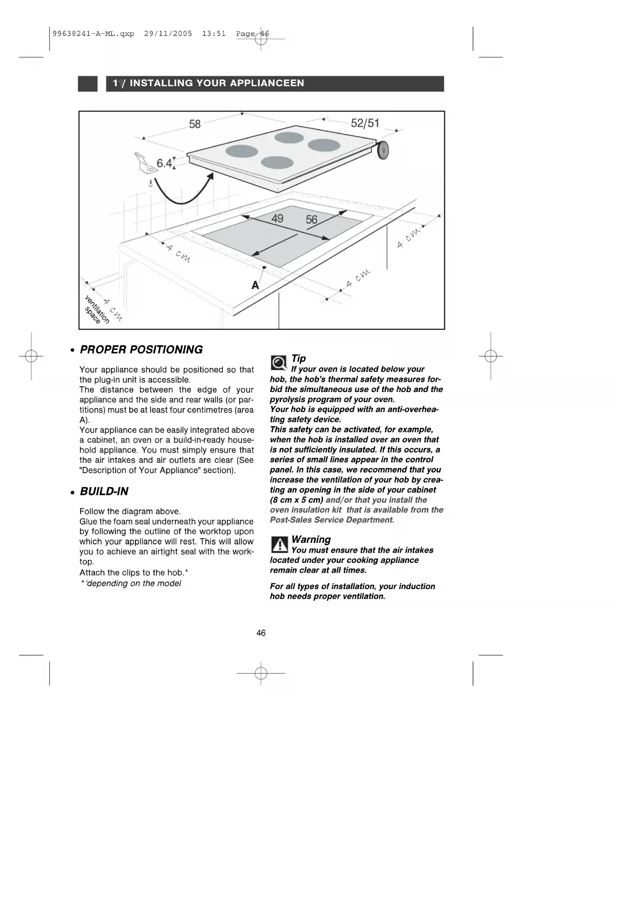 PROPER POSITIONING Your appliance should be positioned so thatthe plug-in unit is accessible.The distance between the edge of yourappliance and the side and rear walls (or par-titions) must be at least four centimetres (area A). Your appliance can be easily integrated abovea cabinet, an oven or a build-in-ready house-hold appliance. You must simply ensure thatthe air intakes and air outlets are clear (See"Description of Your Appliance" section). BUILD-IN Follow the diagram above.Glue the foam seal underneath your applianceby following the outline of the worktop uponwhich your appliance will rest. This will allowyou to achieve an airtight seal with the work- top. Attach the clips to the hob.***depending on the model