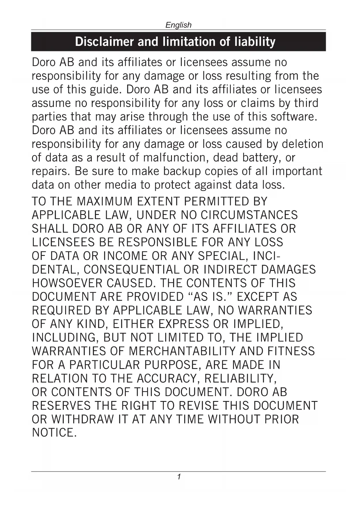 TO THE MAXIMUM EXTENT PERMITTED BY APPLICABLE LAW, UNDER NO CIRCUMSTANCES SHALL DORO AB OR ANY OF ITS AFFILIATES OR LICENSEES BE RESPONSIBLE FOR ANY LOSS OF DATA OR INCOME OR ANY SPECIAL, INCIDENTAL, CONSEQUENTIAL OR INDIRECT DAMAGES HOWSOEVER CAUSED. THE CONTENTS OF THIS DOCUMENT ARE PROVIDED "AS IS." EXCEPT AS REQUIRED BY APPLICABLE LAW, NO WARRANTYIES OF ANY KIND, EITHER EXPRESS OR IMPLIED, INCLUDING, BUT NOT LIMITED TO, THE IMPLIED WARRANTYES OF MERCHANTABILITY AND FITNESS FOR A PARTICULAR PURPOSE, ARE MADE IN RELATION TO THE ACCURACY, RELIABILITY, OR CONTENTS OF THIS DOCUMENT. DORO AB RESERVES THE RIGHT TO REVISE THIS DOCUMENT OR WITHDRAW IT AT ANY TIME WITHOUT PRIOR NOTICE.