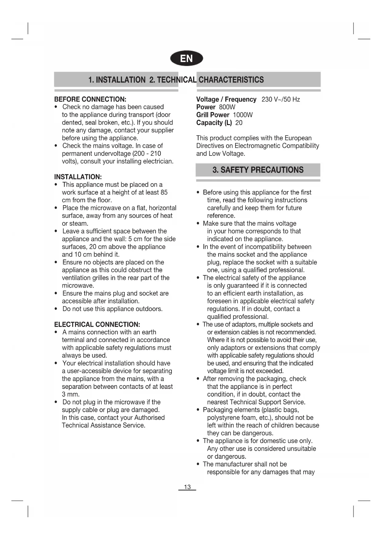 1. INSTALLATION 2. TECHNICAL CHARACTERISTICS Voltage / Frequency 230 V~/50 Hz