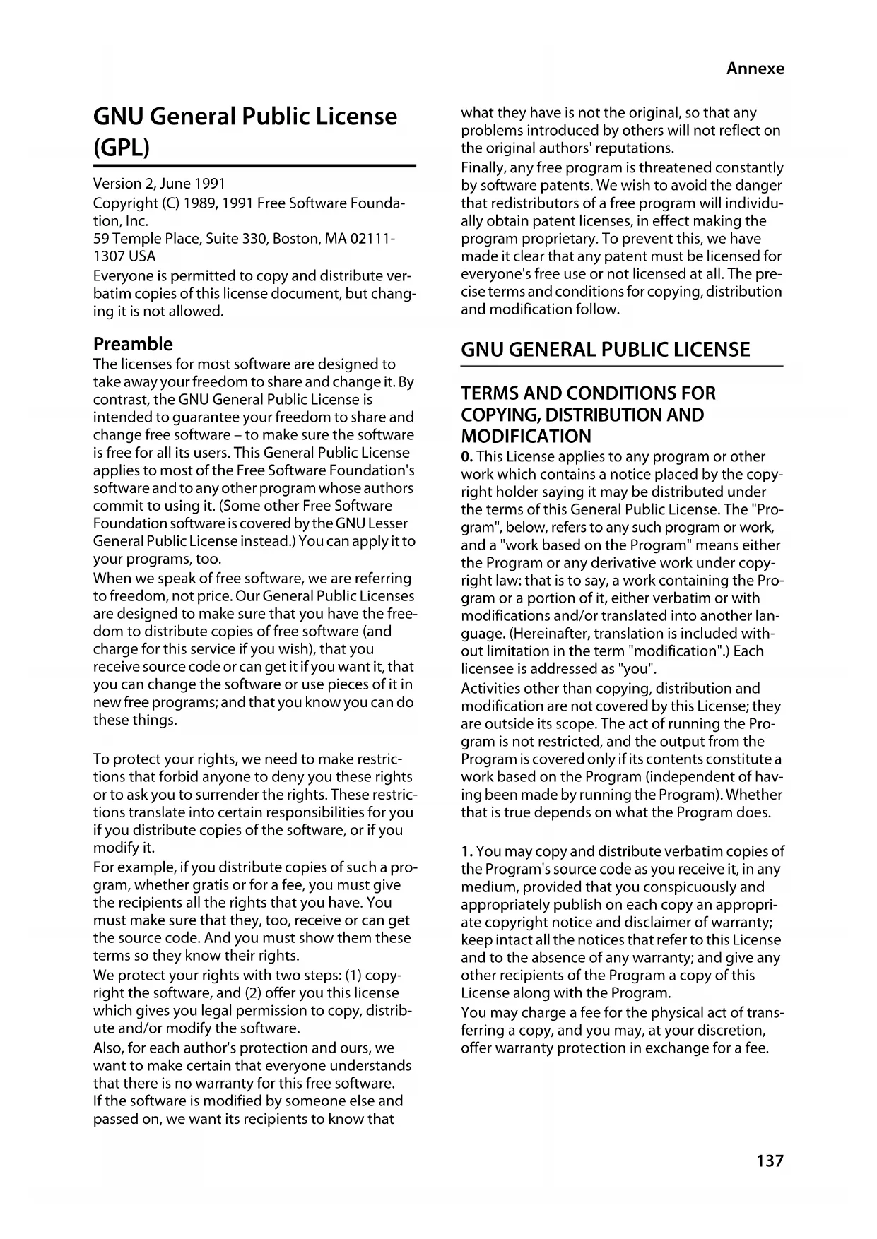 How to Apply These Terms to Your New Programs If you develop a new program, and you want it to be of the greatest possible use to the public, the best way to achieve this is to make it free software which everyone can redistribute and change under these terms. To do so, attach the following notices to the pro- gram. It is safest to attach them to the start of each source file to most effectively convey the exclu- sion of warranty; and each file should have at least the "copyright" line and a pointer to where the full notice is found. You should have received a copy of the GNU Gen- eral Public License along with this program; if not, write to the Free Software Foundation, Inc., 59 Temple Place, Suite 330, Boston, MA 02111-1307 USA Also add information on how to contact you by electronic and paper mail. If the program is interactive, make it output a short notice like this when it starts in an interac- tive mode: The hypothetical commands `show w' and `show c' should show the appropriate parts of the Gen- eral Public License. Of course, the commands you use may be called something other than `show w' and `show c'; they could even be mouse-clicks or menu items – whatever suits your program. You should also get your employer (if you work as a programmer) or your school, if any, to sign a "copyright disclaimer" for the program, if neces- sary. Here is a sample; alter the names: <one line to give the program's name and a brief idea of what it does.> Copyright (C) <year> <name of author> This program is free software; you can redistrib- ute it and/or modify it under the terms of the GNU General Public License as published by the Free Software Foundation; either version 2 of the License, or (at your option) any later version. This program is distributed in the hope that it will be useful, but WITHOUT ANY WARRANTY; without even the implied warranty of MER- CHANTABILITY or FITNESS FOR A PARTICULAR PURPOSE. See the GNU General Public License for more details. Gnomovision version 69, Copyright (C) <year> <name of author> Gnomovision comes with ABSOLUTELY NO WARRANTY; for details type `show w'. This is free software, and you are welcome to redistrib- ute it under certain conditions; type `show c' for details. Yoyodyne, Inc., hereby disclaims all copyright interest in the program `Gnomovision' (which makes passes at compilers) written by James Hacker. <signature of Ty Coon>, 1 April 1989, Ty Coon, President of Vice141 Annexe Gigaset DX600A isdn / SWZ Retail FR / A31008-N3101-F101-2-7719 / appendix.fm Version 4, 16.09.2005 This General Public License does not permit incor- porating your program into proprietary programs. If your program is a subroutine library, you may consider it more useful to permit linking proprie- tary applications with the library. If this is what you want to do, use the GNU Lesser General Public License instead of this License. GNU Lesser General Public License (LGPL) Version 2.1, February 1999 Copyright (C) 1991, 1999 Free Software Founda- tion, Inc. 59 Temple Place, Suite 330, Boston, MA 02111- 1307 USA Everyone is permitted to copy and distribute ver- batim copies of this license document, but chang- ing it is not allowed. [This is the first released version of the Lesser GPL. It also counts as the successor of the GNU Library Public License, version 2, hence the version number 2.1.] Preamble The licenses for most software are designed to take away your freedom to share and change it. By contrast, the GNU General Public Licenses are intended to guarantee your freedom to share and change free software--to make sure the software is free for all its users. This license, the Lesser General Public License, applies to some specially designated software packages – typically libraries – of the Free Soft- ware Foundation and other authors who decide to use it. You can use it too, but we suggest you first think carefully about whether this license or the ordinary General Public License is the better strat- egy to use in any particular case, based on the explanations below. When we speak of free software, we are referring to freedom of use, not price. Our General Public Licenses are designed to make sure that you have the freedom to distribute copies of free software (and charge for this service if you wish); that you receive source code or can get it if you want it; that you can change the software and use pieces of it in new free programs; and that you are informed that you can do these things. To protect your rights, we need to make restric- tions that forbid distributors to deny you these rights or to ask you to surrender these rights. These restrictions translate into certain responsi- bilities for you if you distribute copies of the library or if you modify it. For example, if you distribute copies of the library, whether gratis or for a fee, you must give the recipients all the rights that we gave you. You must make sure that they, too, receive or can get the source code. If you link other code with the library, you must provide complete object files to the recipients, so that they can relink them with the library after making changes to the library and recompiling it. And you must show them these terms so they know their rights. We protect your rights with a two-step method: (1) we copyright the library, and (2) we offer you this license, which gives you legal permission to copy, distribute and/or modify the library. To protect each distributor, we want to make it very clear that there is no warranty for the free library. Also, if the library is modified by someone else and passed on, the recipients should know that what they have is not the original version, so that the original author's reputation will not be affected by problems that might be introduced by others. Finally, software patents pose a constant threat to the existence of any free program. We wish to make sure that a company cannot effectively restrict the users of a free program by obtaining a restrictive lic