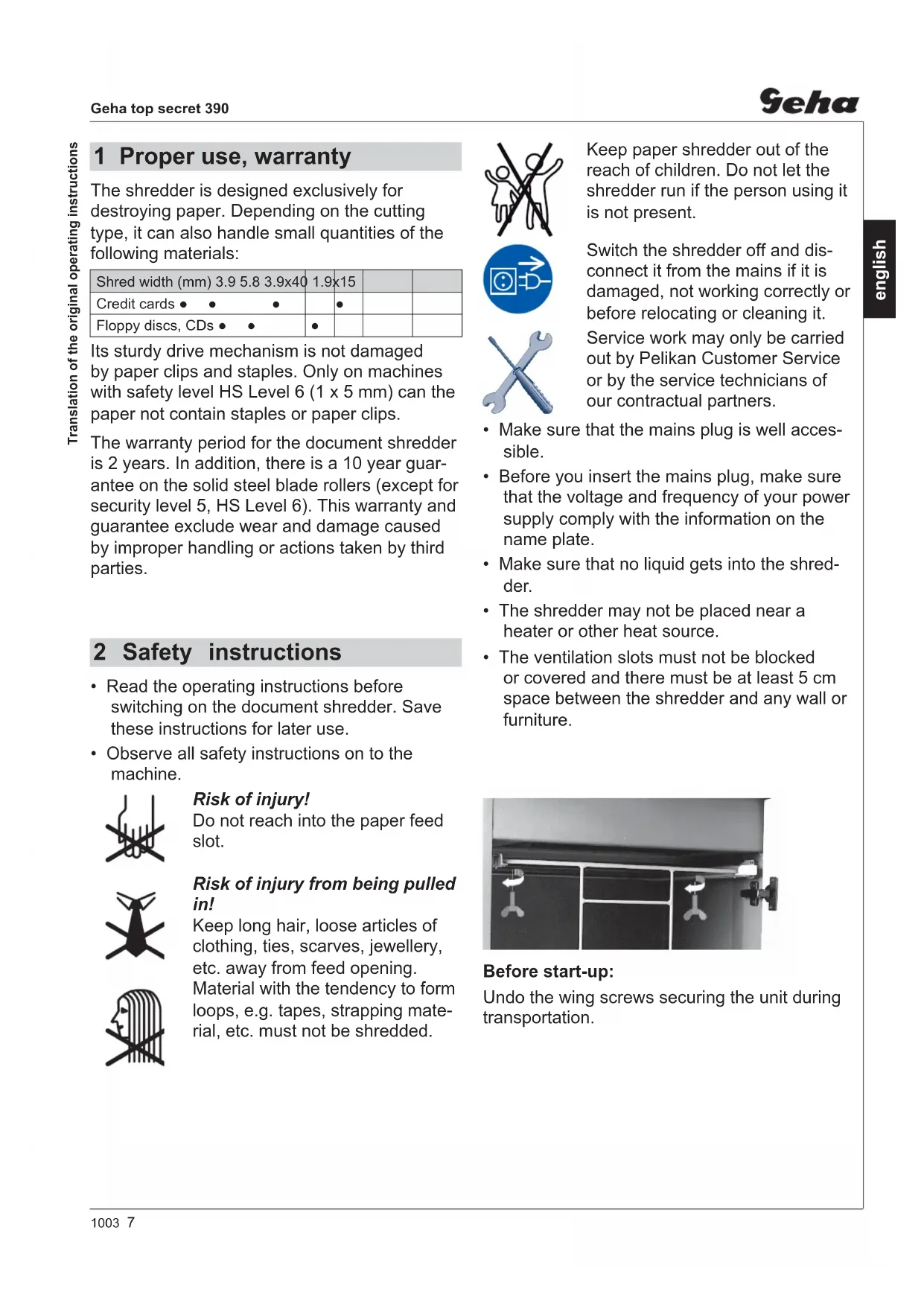 - EN 60950-1:20061003 7 Geha top secret 390 english The shredder is designed exclusively for destroying paper. Depending on the cutting type, it can also handle small quantities of the following materials: Shred width (mm) 3.9 5.8 3.9x40 1.9x15 Credit cards ●● ● ● Floppy discs, CDs ●● ● Its sturdy drive mechanism is not damaged by paper clips and staples. Only on machines with safety level HS Level 6 (1 x 5 mm) can the paper not contain staples or paper clips. The warranty period for the document shredder is 2 years. In addition, there is a 10 year guar- antee on the solid steel blade rollers (except for security level 5, HS Level 6). This warranty and guarantee exclude wear and damage caused by improper handling or actions taken by third parties. 1 Proper use, warranty Before start-up: Undo the wing screws securing the unit during transportation. Keep paper shredder out of the reach of children. Do not let the shredder run if the person using it is not present. Switch the shredder off and dis- connect it from the mains if it is damaged, not working correctly or before relocating or cleaning it. Service work may only be carried out by Pelikan Customer Service or by the service technicians of our contractual partners.