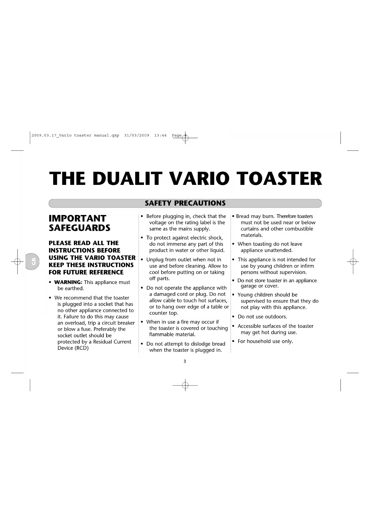 - Do not operate any appliance with a damaged lead or plug, or after the appliance malfunctions, or has been damaged in any manner. If the mains lead is damaged, it must be replaced by a special cordset available from Dualit helpline: + 44 (0) 1293 652 500 SAVE THESE INSTRUCTIONS SAFETY PRECAUTIONS