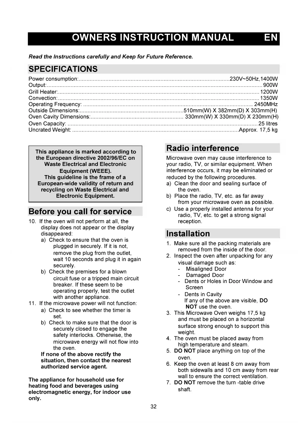 SPECIFICATIONS Power consumption:230V~50Hz,1400W Output:900W Grill Heater:1200W Convection:1350W Operating Frequency: 2450MHz