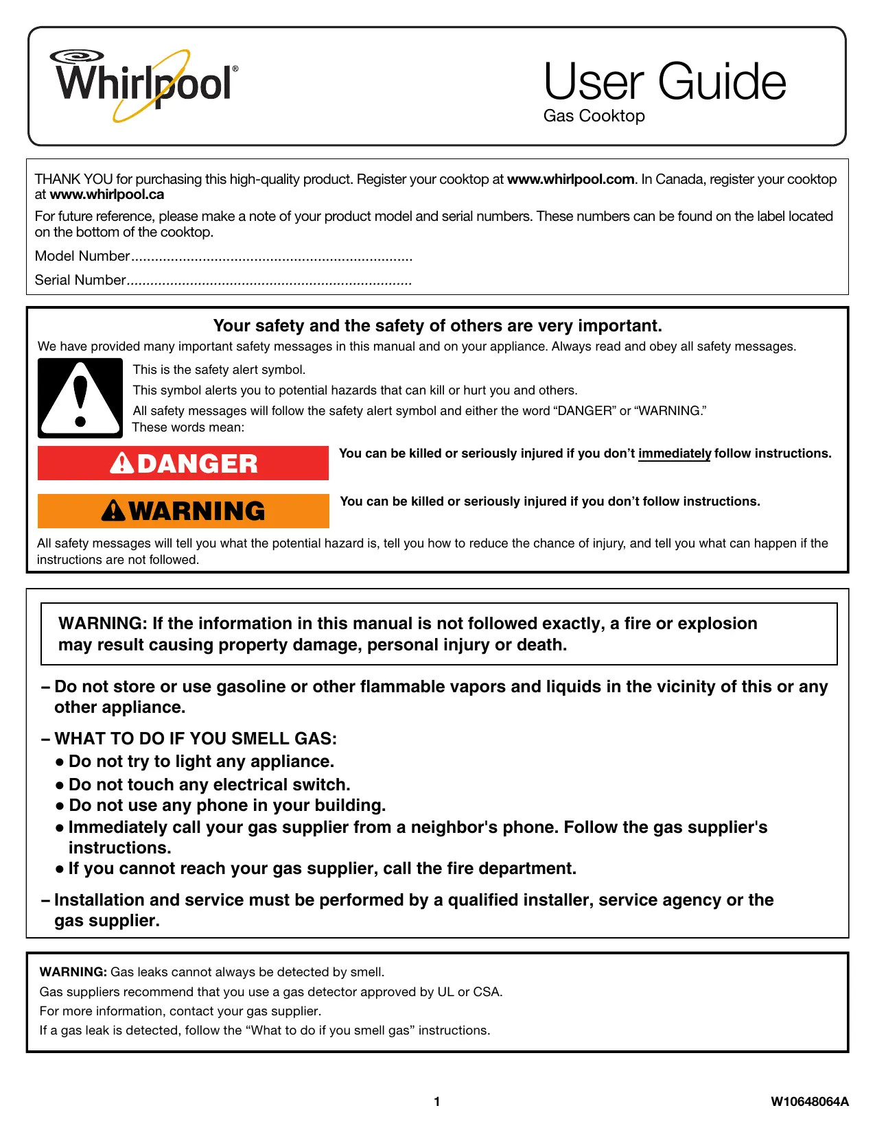 User Guide Gas Cooktop THANK YOU for purchasing this high-quality product. Register your cooktop at www.whirlpool.com. In Canada, register your cooktop at www.whirlpool.ca For future reference, please make a note of your product model and serial numbers. These numbers can be found on the label located on the bottom of the cooktop. Model Number....................................................................... Serial Number........................................................................ Your safety and the safety of others are very important. We have provided many important safety messages in this manual and on your appliance. Always read and obey all safety messages. This is the safety alert symbol. This symbol alerts you to potential hazards that can kill or hurt you and others. All safety messages will follow the safety alert symbol and either the word “DANGER” or “WARNING.” These words mean: DANGER WARNING You can be killed or seriously injured if you don’t immediately follow instructions. You can be killed or seriously injured if you don’t follow instructions. All safety messages will tell you what the potential hazard is, tell you how to reduce the chance of injury, and tell you what can happen if the instructions are not followed.