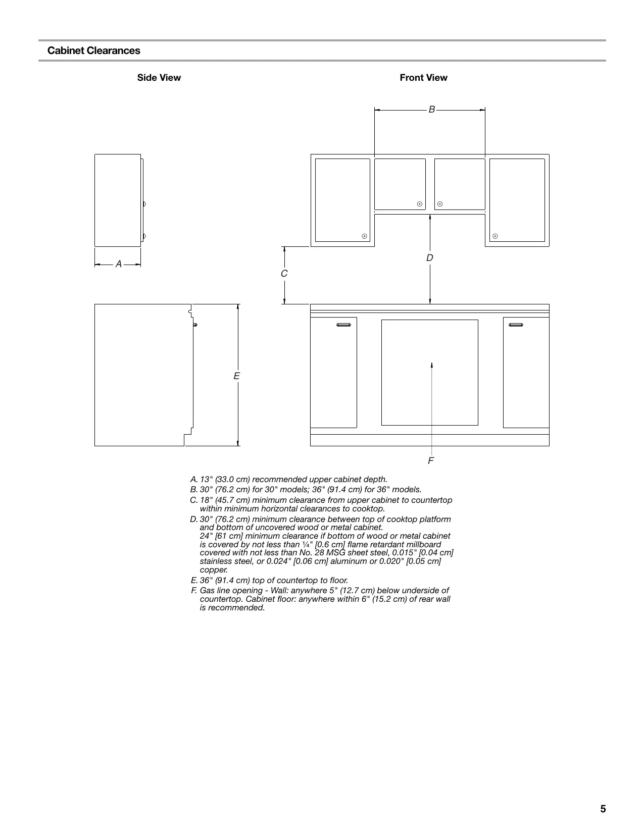 A. 13" (33.0 cm) recommended upper cabinet depth. B. 30" (76.2 cm) for 30" models; 36" (91.4 cm) for 36" models. C. 18" (45.7 cm) minimum clearance from upper cabinet to countertop within minimum horizontal clearances to cooktop. D. 30" (76.2 cm) minimum clearance between top of cooktop platform and bottom of uncovered wood or metal cabinet. 24" [61 cm] minimum clearance if bottom of wood or metal cabinet is covered by not less than ¹⁄₄" [0.6 cm] flame retardant millboard covered with not less than No. 28 MSG sheet steel, 0.015" [0.04 cm] stainless steel, or 0.024" [0.06 cm] aluminum or 0.020" [0.05 cm] copper. E. 36" (91.4 cm) top of countertop to floor. F. Gas line opening - Wall: anywhere 5" (12.7 cm) below underside of countertop. Cabinet floor: anywhere within 6" (15.2 cm) of rear wall is recommended.