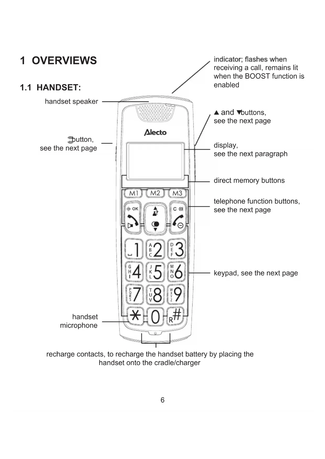 handset speaker display, see the next paragraph handset microphone recharge contacts, to recharge the handset battery by placing the handset onto the cradle/charger button, see the next page and buttons, see the next page keypad, see the next page telephone function buttons, see the next page direct memory buttons receiving a call, remains lit when the BOOST function is enabled7 BOOST button: during a call, press to enable the extra amplier and buttons: during a call, press to increase or decrease the volume in standby mode, press to open the menu during setup, press to conrm your settings press to answer an incoming call or to start a phone conversation during a call, press again to enable or disable the speaker function in standby mode, press to open the Caller-ID memory press to scroll memories or settings during a call, press to increase the volume in standby mode, press to open the last dialled number memory press to scroll memories or settings during a call, press to decrease the volume correction button when entering phone numbers or names during a call, press to switch o the microphone in stand-by mode, press to start an intercom call during setup, press to go back one step press to end a call press and hold (> 5 sec.) to switch o the handset 0-9 buttons: to dial phone numbers and to enter memories 0 button: press and hold to insert a dialling space ‘asterisk’ and ‘pound’ buttons: used for e.g. telecom banking R button: function button for certain telecom services8