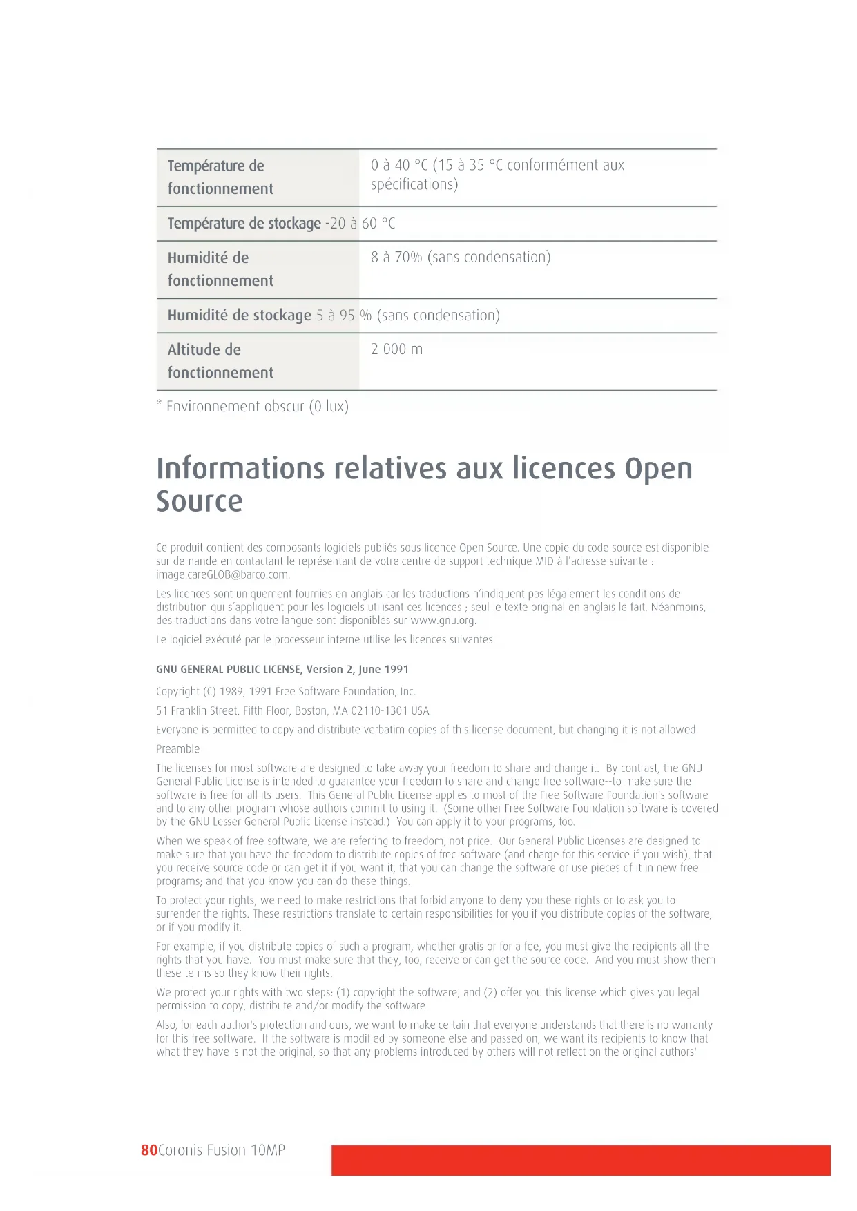 - Environnement obscur (0 lux) Informations relatives aux licences Open Source Ce produit contient des composants logiciels publiés sous licence Open Source. Une copie du code source est disponible sur demande en contactant le représentant de votre centre de support technique MID à l’adresse suivante : image.careGLOB@barco.com. Les licences sont uniquement fournies en anglais car les traductions n’indiquent pas légalement les conditions de distribution qui s’appliquent pour les logiciels utilisant ces licences ; seul le texte original en anglais le fait. Néanmoins, des traductions dans votre langue sont disponibles sur www.gnu.org. Le logiciel exécuté par le processeur interne utilise les licences suivantes. GNU GENERAL PUBLIC LICENSE, Version 2, June 1991 Copyright (C) 1989, 1991 Free Software Foundation, Inc. 51 Franklin Street, Fifth Floor, Boston, MA 02110-1301 USA Everyone is permitted to copy and distribute verbatim copies of this license document, but changing it is not allowed. Preamble The licenses for most software are designed to take away your freedom to share and change it. By contrast, the GNU General Public License is intended to guarantee your freedom to share and change free software--to make sure the software is free for all its users. This General Public License applies to most of the Free Software Foundation's software and to any other program whose authors commit to using it. (Some other Free Software Foundation software is covered by the GNU Lesser General Public License instead.) You can apply it to your programs, too. When we speak of free software, we are referring to freedom, not price. Our General Public Licenses are designed to make sure that you have the freedom to distribute copies of free software (and charge for this service if you wish), that you receive source code or can get it if you want it, that you can change the software or use pieces of it in new free programs; and that you know you can do these things. To protect your rights, we need to make restrictions that forbid anyone to deny you these rights or to ask you to surrender the rights. These restrictions translate to certain responsibilities for you if you distribute copies of the software, or if you modify it. For example, if you distribute copies of such a program, whether gratis or for a fee, you must give the recipients all the rights that you have. You must make sure that they, too, receive or can get the source code. And you must show them these terms so they know their rights. We protect your rights with two steps: (1) copyright the software, and (2) offer you this license which gives you legal permission to copy, distribute and/or modify the software. Also, for each author's protection and ours, we want to make certain that everyone understands that there is no warranty for this free software. If the software is modified by someone else and passed on, we want its recipients to know that what they have is not the original, so that any problems introduced by others will not reflect on the original authors' Température de fonctionnement 0 à 40 °C (15 à 35 °C conformément aux spécifications) Température de stockage -20 à 60 °C Humidité de fonctionnement 8 à 70% (sans condensation) Humidité de stockage 5 à 95 % (sans condensation) Altitude de fonctionnement 2 000 mCoronis Fusion 10MP 81 reputations. Finally, any free program is threatened constantly by software patents. We wish to avoid the danger that redistributors of a free program will individually obtain patent licenses, in effect making the program proprietary. To prevent this, we have made it clear that any patent must be licensed for everyone's free use or not licensed at all. The precise terms and conditions for copying, distribution and modification follow.