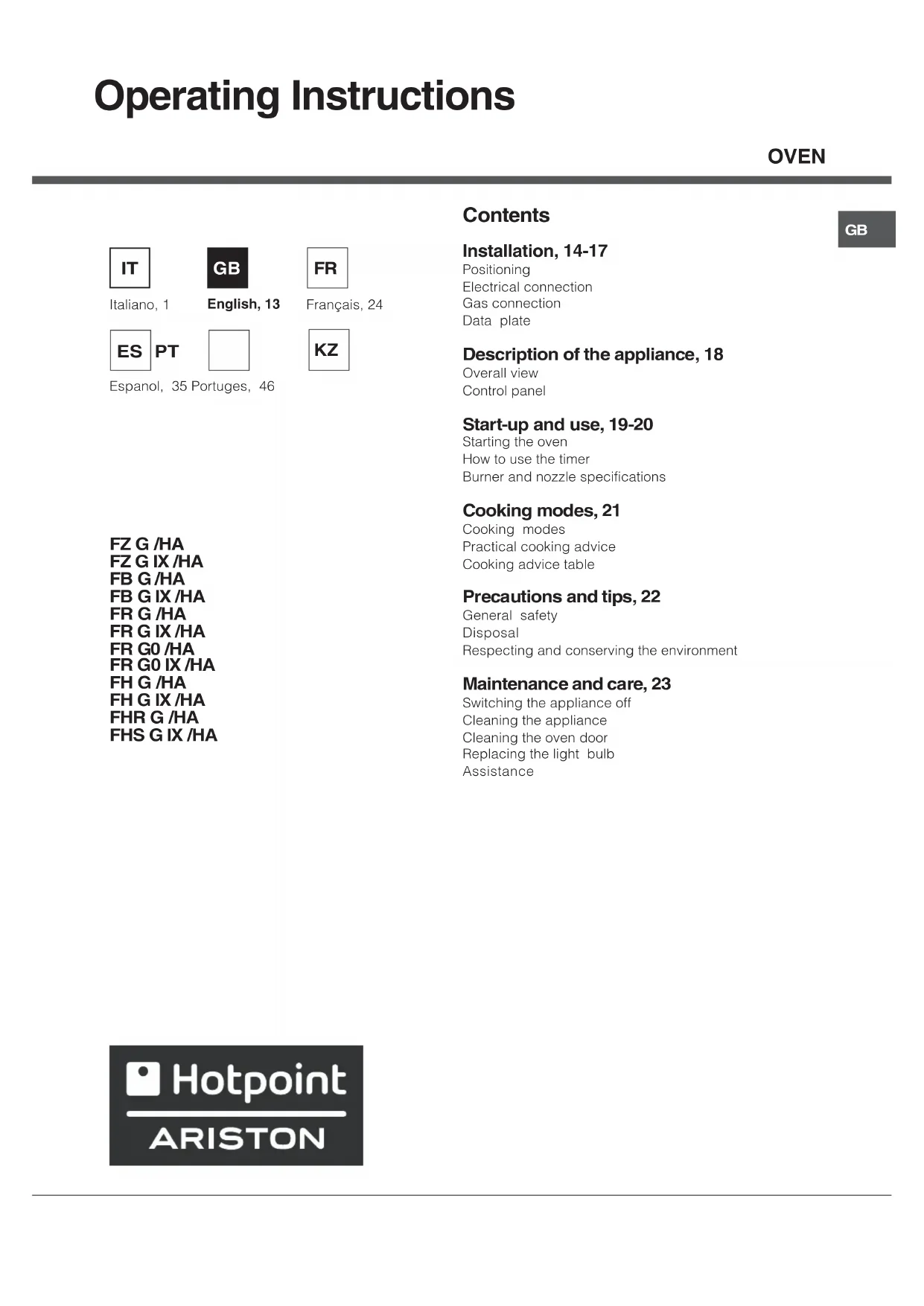 Download the instructions for your Oven in PDF format for free! Find your manual FZ G IX HA - HOTPOINT-ARISTON and take your electronic device back in hand. On this page are published all the documents necessary for the use of your device. FZ G IX HA by HOTPOINT-ARISTON.