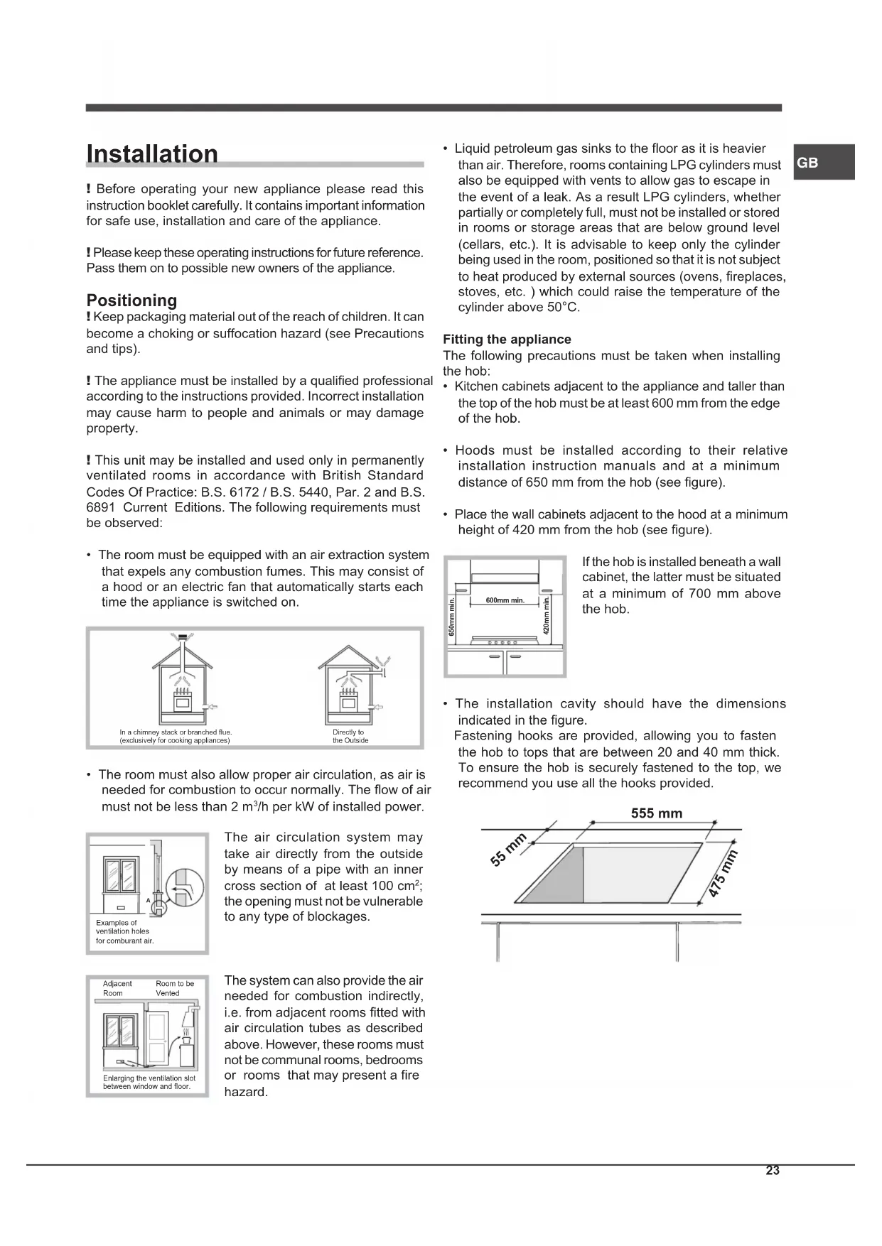 Installation ! Before operating your new appliance please read this instruction booklet carefully. It contains important information for safe use, installation and care of the appliance. ! Please keep these operating instructions for future reference. Pass them on to possible new owners of the appliance. Positioning ! Keep packaging material out of the reach of children. It can become a choking or suffocation hazard (see Precautions and tips). ! The appliance must be installed by a qualied professional according to the instructions provided. Incorrect installation may cause harm to people and animals or may damage property. ! This unit may be installed and used only in permanently ventilated rooms in accordance with British Standard Codes Of Practice: B.S. 6172 / B.S. 5440, Par. 2 and B.S. 6891 Current Editions. The following requirements must be observed: