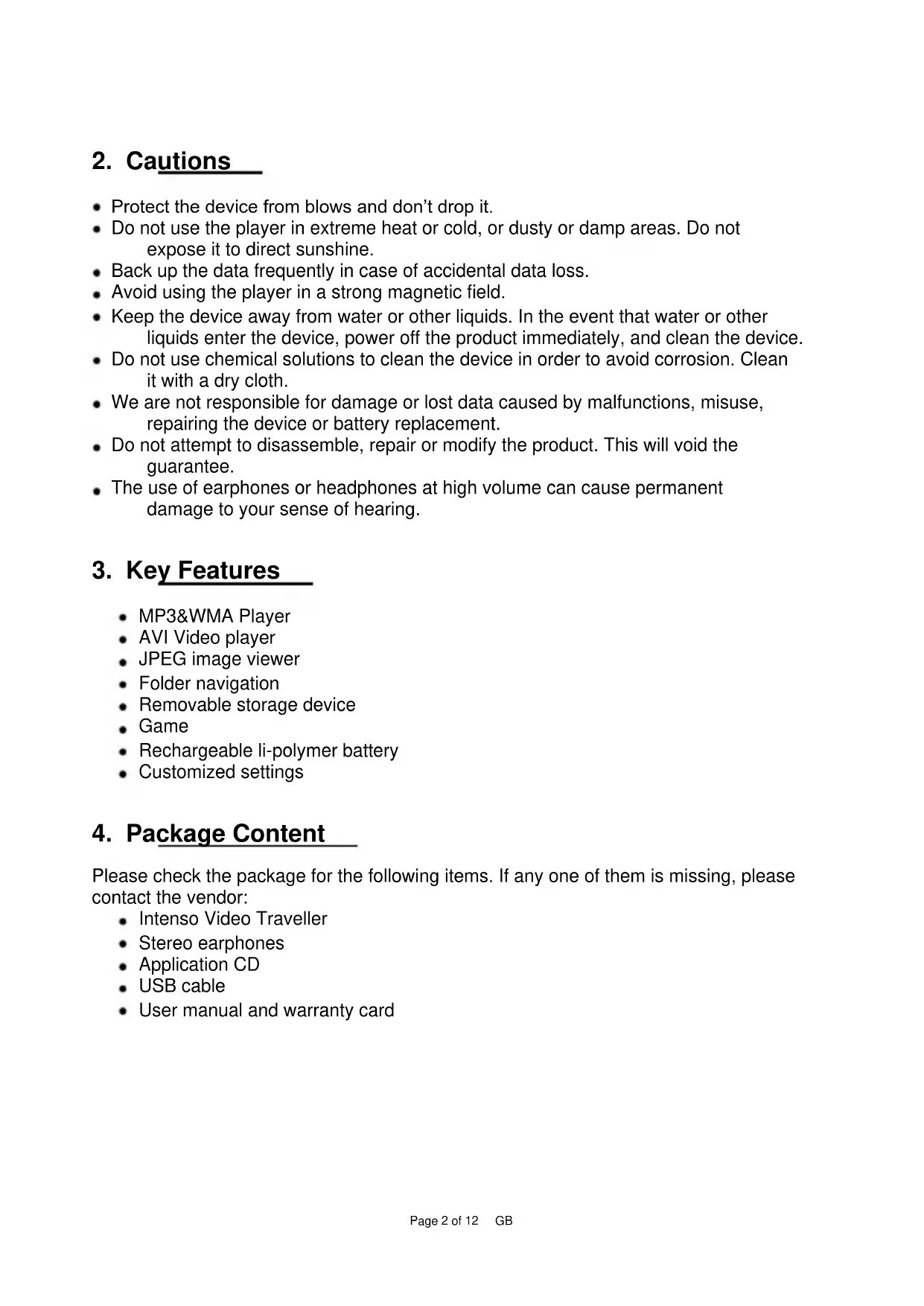 Please check the package for the following items. If any one of them is missing, please contact the vendor: Intenso Video Traveller Stereo earphones Application CD USB cable User manual and warranty cardPage 3 of 12 GB