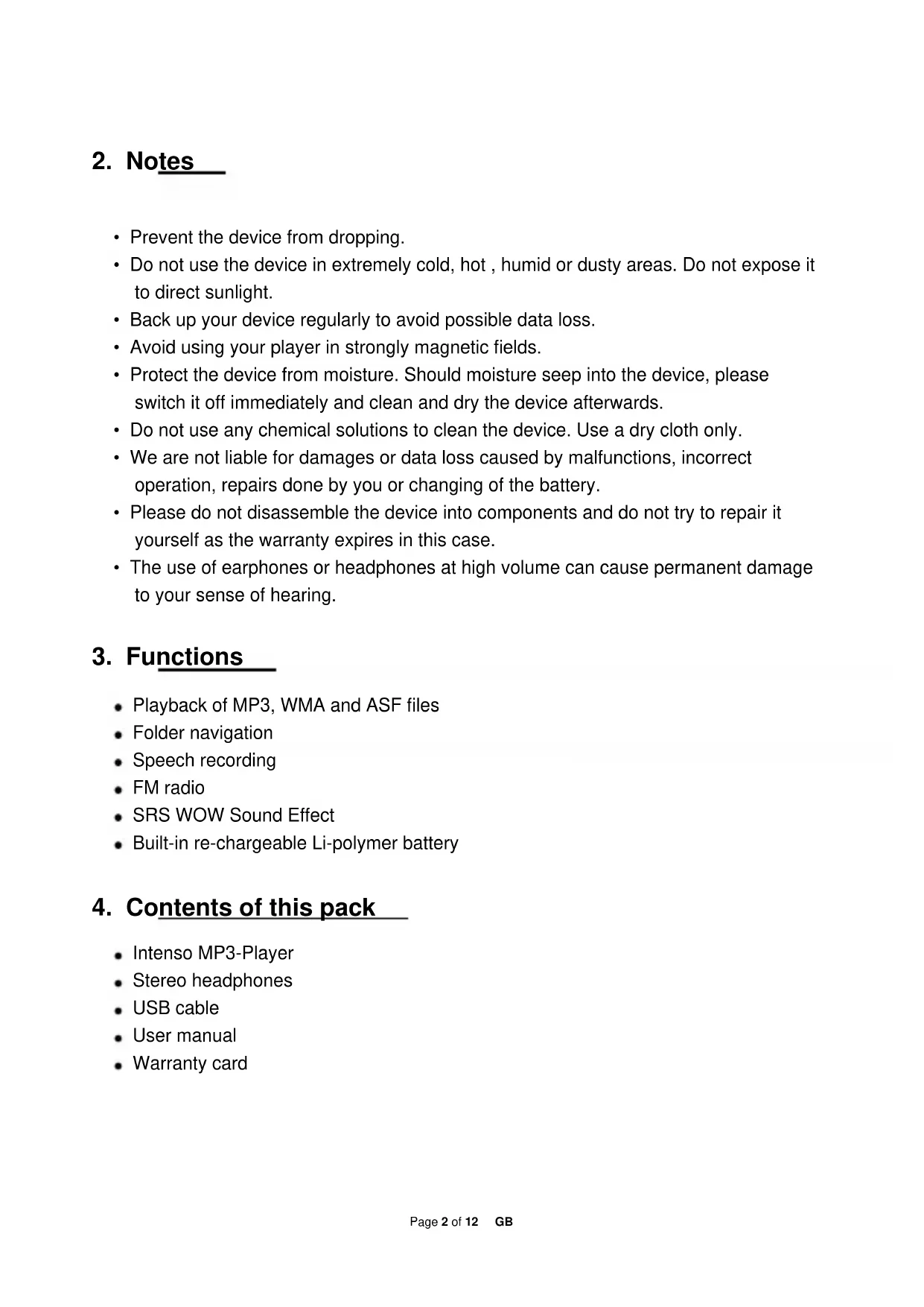 To select a playback mode do the following: (1) During playback of a track press the menu button to go to the "play setup" menu. (2) Press the / buttons to select "repeat" and confirm your selection with the menu button. (3) Press the / buttons to select the desired playback mode. Confirm your selection with the menu button or press the Play/Pause button to return to the sub-menu. Equalizer You can choose from the following sound effects for playback: flat, rock, pop, classic, soft, jazz, DBB and user EQ. To select an equalizer setting do the following: (1) During playback of a track press the menu button to go to the "play setup" menu. (2) Press the / buttons to select "equalizer" and confirm your selection with the menu button. (3) Press the / buttons to select the desired equalizer setting. Confirm your selection with the menu button or press the Play/Pause button to return to the sub-menu.Page 7 of 12 GB User-defined equalizer (1) During playback of a track press the menu button to go to the "play setup" menu. (2) Press the / buttons to select "equalizer" and confirm your selection with the menu button. (3) Press the / buttons to select “User EQ” and confirm your selection with the menu button. (4) Press the / buttons to change the equalizer column and the VOL+/VOL- to set the desired values. (5) Press the menu button to confirm the settings. SRS and WOW sound effects The MP3-player offers the sound effects SRS and WOW to extend your musical experience. To activate the effects do the following: (1) During playback of a track press the menu button to go to the "play setup" menu. (2) Press the / buttons to select the “SRS WOW mode” and confirm your selection with the menu button. (3) Press the / buttons to select “SRS WOW” and confirm your selection with the menu button. Adjusting WOW settings: a. Select "adjust WOW" and confirm with the menu button. b. Select using the / buttons “SRS 3D”, “TruBass” or “FOCUS” and confirm with the menu button. Press the VOL + or VOL - button to adjust the settings. c. Confirm your settings with the menu button. Note: WOW, SRS and the symbol are trademarks of SRS Labs, Inc. The WOW technology is licensed by SRS Labs, Inc. Exit music mode Keep the menu button pressed for 3 seconds to go to the main menu.Page 8 of 12 GB