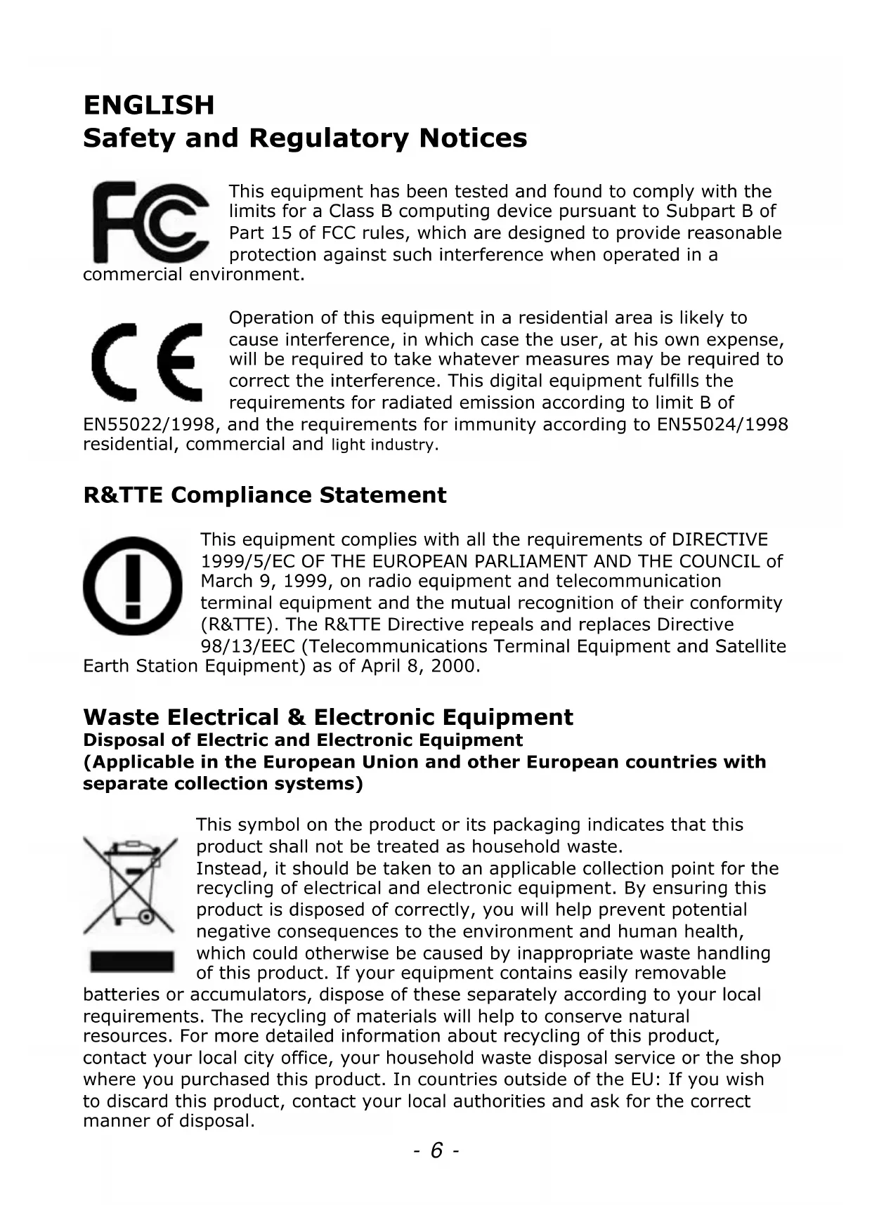 This equipment complies with all the requirements of DIRECTIVE 1999/5/EC OF THE EUROPEAN PARLIAMENT AND THE COUNCIL of March 9, 1999, on radio equipment and telecommunication terminal equipment and the mutual recognition of their conformity (R&TTE). The R&TTE Directive repeals and replaces Directive 98/13/EEC (Telecommunications Terminal Equipment and Satellite