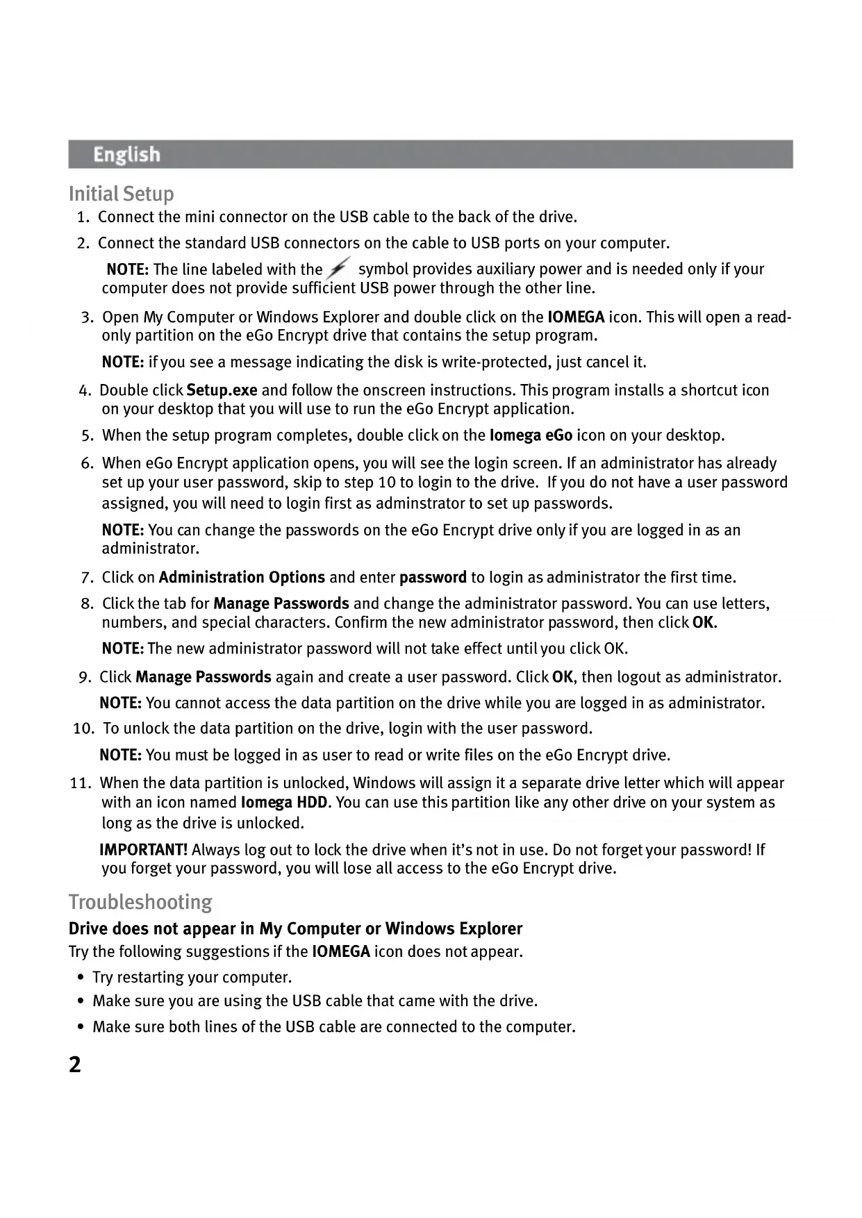 - Try changing the cable connections to different USB ports on the computer. If the IOMEGA icon appears, but there is no icon for the Iomega HDD data partition, double click the Iomega eGo icon on the desktop and enter the user password to unlock the drive. The Iomega HDD partition is visible only when you are logged in as user. If the problem continues, see the support area on www.iomega.com for additional troubleshooting help. Using the Drive User Access When you are logged in as user, you can access the Iomega HDD data partition on the eGo Encrypt drive. This allows you to view, change, and create files on the data partition. The user login does not provide access to change passwords or secure erase the drive. Always log out when the drive is not in use to protect the security of your data. If you want to disconnect from USB, log out first, then use the safe removal process for your operating system. CAUTION! To prevent data loss, do not disconnect the drive during data transfer (activity light flashing). Administrator Access The drive administrator can set or change both administrator and user passwords. The administrator can also perform a secure erase, which will destroy all data stored on the drive. The administrator login does not provide access to the data partition on the drive. Secure Erase Secure erase is an unrecoverable procedure that destroys all data stored on the Iomega HDD data partition. You must be logged in as administrator to perform a secure erase. After completing a secure erase, you must format the data partition with an NTFS file system. You will need to logout as administrator and login as user in order to format the data partition. Refer to the HTML user’s manual for detailed instructions. Complete User’s Manual A complete user’s manual in HTML format is available on the support area on www.iomega.com. Limited Warranty Iomega warrants this hardware product to be free from defects in materials and workmanship for the warranty period. This non-transferable, limited warranty is only to you, the first end-user purchaser. The warranty begins on the date of purchase and lasts for a period of one (1) year for product purchased in the Americas or the Asia-Pacific region; ninety (90) days for Iomega reconditioned products purchased in these regions; or, two (2) years for product purchased by an end-user in Europe, the Middle East, or Africa. Customers who register their new products at www.iomegareg.com within 90 days of purchase will receive a warranty extension so that their total warranty shall be a period of three (3) years in all regions. NOTE: Reconditioned products are not eligible for a warranty extension. This warranty does not apply to: (a) Iomega software products; (b) expendable components such as fuses or bulbs; or (c) third party products, hardware or software, supplied with the warranted product. Iomega makes no warranty of any kind on such products which, if included, are provided “AS IS.” This warranty also excludes damage caused by accident, misuse, abuse, use of non-Iomega approved media, exposure of media to excessive magnetic fields, or external environmental causes. Your sole and exclusive remedy for a covered defect is repair or replacement of the defective product, at Iomega’s sole option and expense (shipping may be charged), and Iomega may use new or refurbished parts or products to do so. The replaced part/product will be warranted for the remainder of the original warranty or three (3) months from the date of shipment of such parts/products, whichever is longer. If Iomega is unable to repair or replace a defective product, your alternate exclusive remedy shall be a refund of the original purchase price.4 The above is Iomega’s entire obligation to you under this warranty. IN NO EVENT SHALL IOMEGA BE LIABLE FOR INDIRECT, INCIDENTAL, CONSEQUENTIAL OR SPECIAL DAMAGES OR LOSSES, INCLUDING LOSS OF DATA, USE, OR PROFITS EVEN IF IOMEGA HAS BEEN ADVISED OF THE POSSIBILITY OF SUCH DAMAGES. In no event shall Iomega’s liability exceed the original purchase price of the drive or the media disk. Some jurisdictions do not allow the exclusion or limitation of incidental or consequential damages, so the above limitation or exclusion may not apply to you. Obtaining Warranty Service You must notify Iomega within the warranty period to receive warranty service. Just as technology and market conditions vary, Iomega’s specific customer support policies (including fees for services) and procedures change over time. To obtain information about Iomega’s current policies or warranty service, please visit our website at www.iomega.com/ supportpolicy.html or write to: Iomega Customer Service, 4059 South 1900 West, Roy, UT 84067. Contact Information for Iomega Customer Service in Europe can be obtained on our Support website at www.iomega.com/europe/support. If your product is eligible for warranty service, you will be required to return it to Iomega, along with proper identification, a return authorization number obtained from the Iomega website or provided by the Iomega representative, and proof of purchase. Iomega will not protect, recover, or return data during warranty service so you should duplicate your data before shipment. Limitations THE ABOVE WARRANTY IS EXCLUSIVE AND IN LIEU OF ALL OTHER WARRANTIES, EXPRESS OR IMPLIED. To the extent permitted by applicable law, IOMEGA SPECIFICALLY DISCLAIMS ANY IMPLIED WARRANTIES, INCLUDING ANY IMPLIED WARRANTY OF MERCHANTABILITY OR FITNESS FOR A PARTICULAR PURPOSE. Any implied warranty required by applicable law shall be limited in duration to the express warranty term. Some jurisdictions do not allow disclaimers of implied warranties or limitations on how long an implied warranty lasts, so the above limitation may not apply to you. This warranty gives you pecific legal rights and you may also have other rights that vary from jurisdiction to jurisdiction. Any suit for breach of any warranty on your Produ