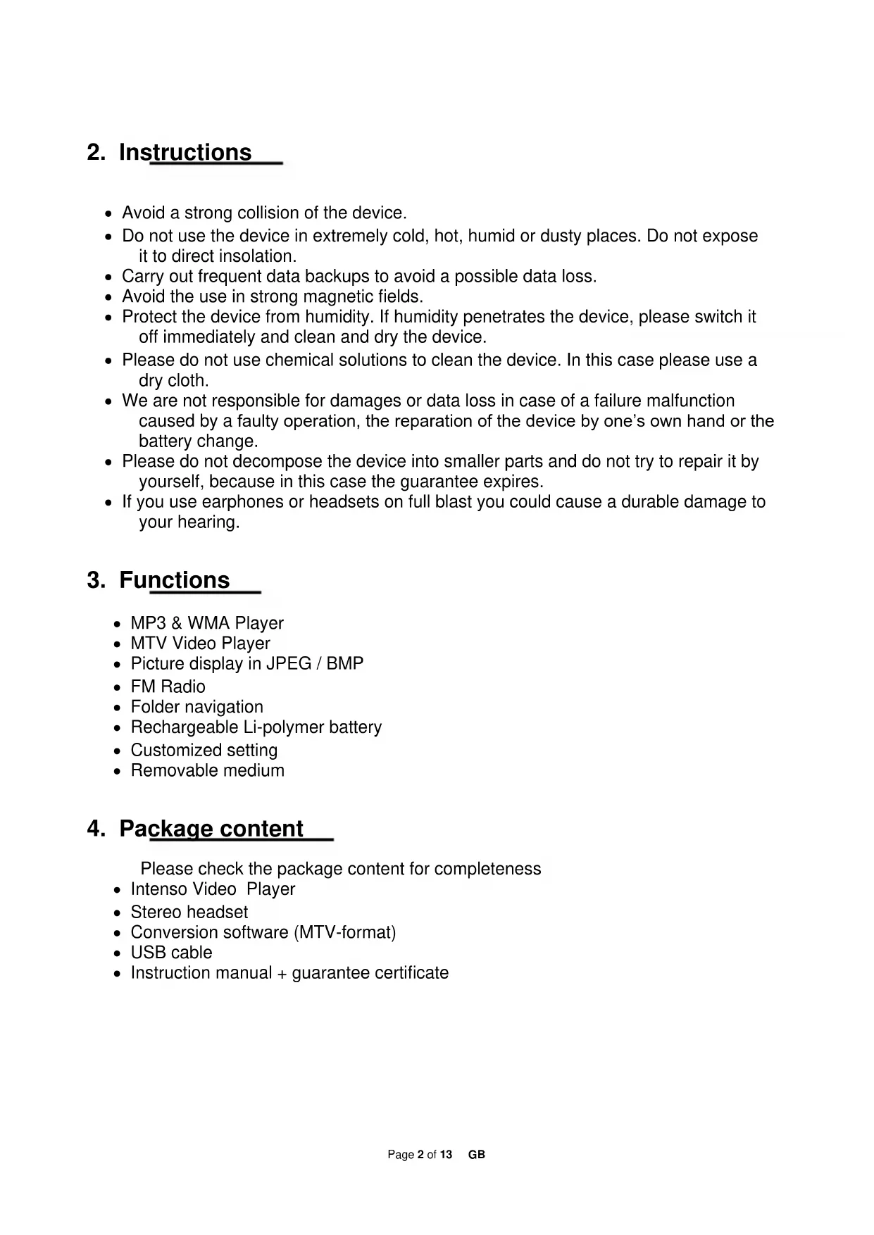 Connect with the PC With the operating systems Windows 98/SE please install a driver before you connect the player with the PC. (The download is available on the following website: www.intenso.de). For the operating systems WIN 2000/XP/ME/Vista/Windows 7 the installation of the driver is not needed. Please go ahead as follows: (1) Connect the player with the USB connection of the PC. (2) The window “Intenso” will open. Now you can save the data from your hard disk on the removable medium. Safe removal from the PC For Windows 2000/XP/ME/Vista/Windows 7: Click with the right mouse button down right in the task bar on the symbol “Remove hardware securely”. In the displayed context menu please select the point “Remove USB mass storage device driver“ with the left mouse button. Please make sure that the data transmission has been completed. Now you can remove the device. For Windows 98/SE: Select the device in the „device manager“ with the left mouse button. Now click on the menu point “Remove“. Make sure also here that the data transmission has been completed. Now the device can by disconnected from the computer. Battery charge: The device is equipped with an integrated li-polymer battery. The battery is charged by the USB connection with your PC. At the first use of the device please pay attention that the battery is completely charged, in general this process takes 4 hours. To charge the battery please connect the device with the PC by the USB cable. The charging process starts automatically. If you would like to know the actual status of the charging process, please disconnect the device from the PC. On the display top right you can see a battery symbol. If the symbol flashes green, the battery is completely charged. Instruction: To achieve an optimal performance the li-polymer battery must be regularly used. If this is not the case, charge the battery completely at least once per month.Page 4 of 13 GB Operation components