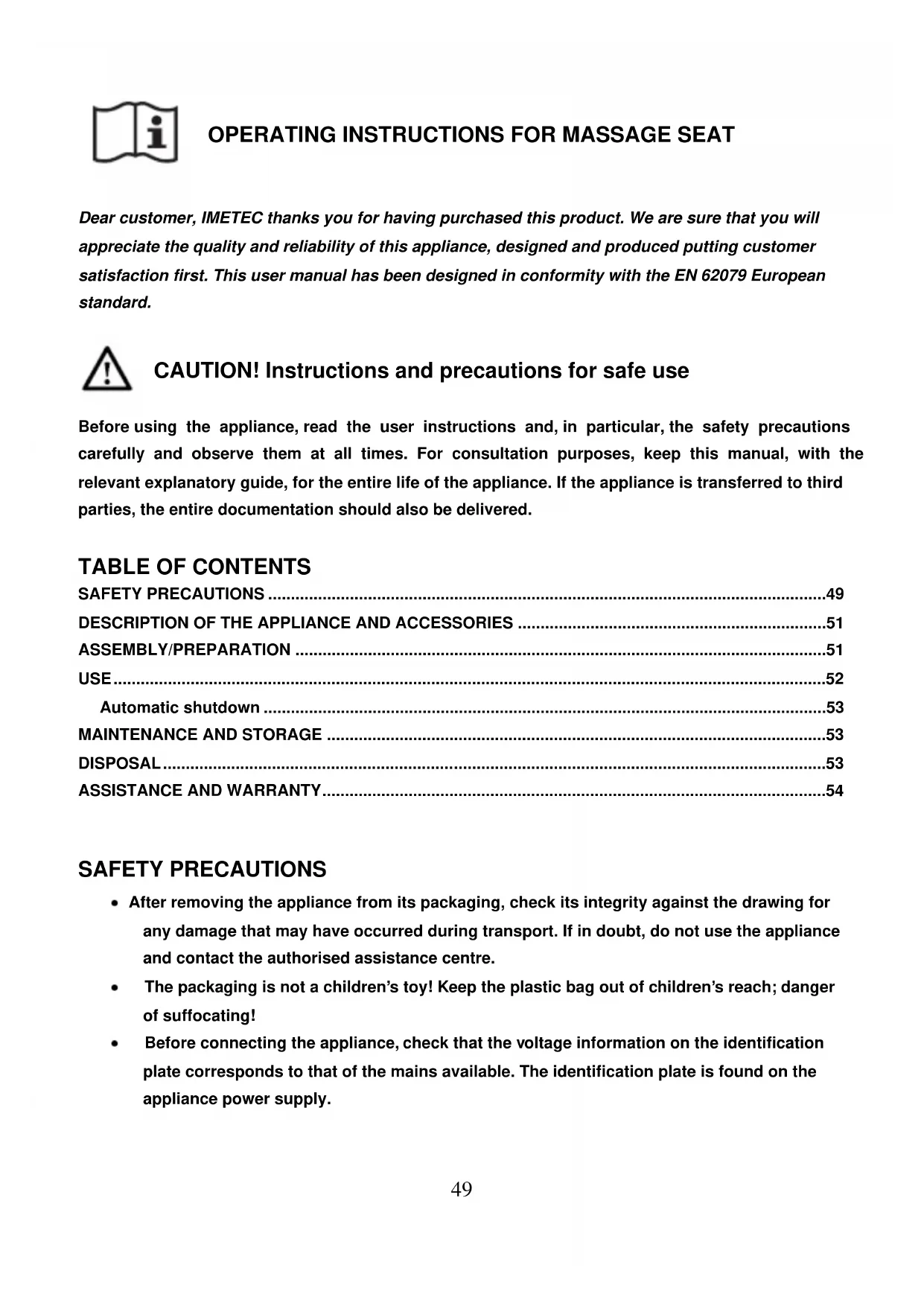 OPERATING INSTRUCTIONS FOR MASSAGE SEAT Dear customer, IMETEC thanks you for having purchased this product. We are sure that you will