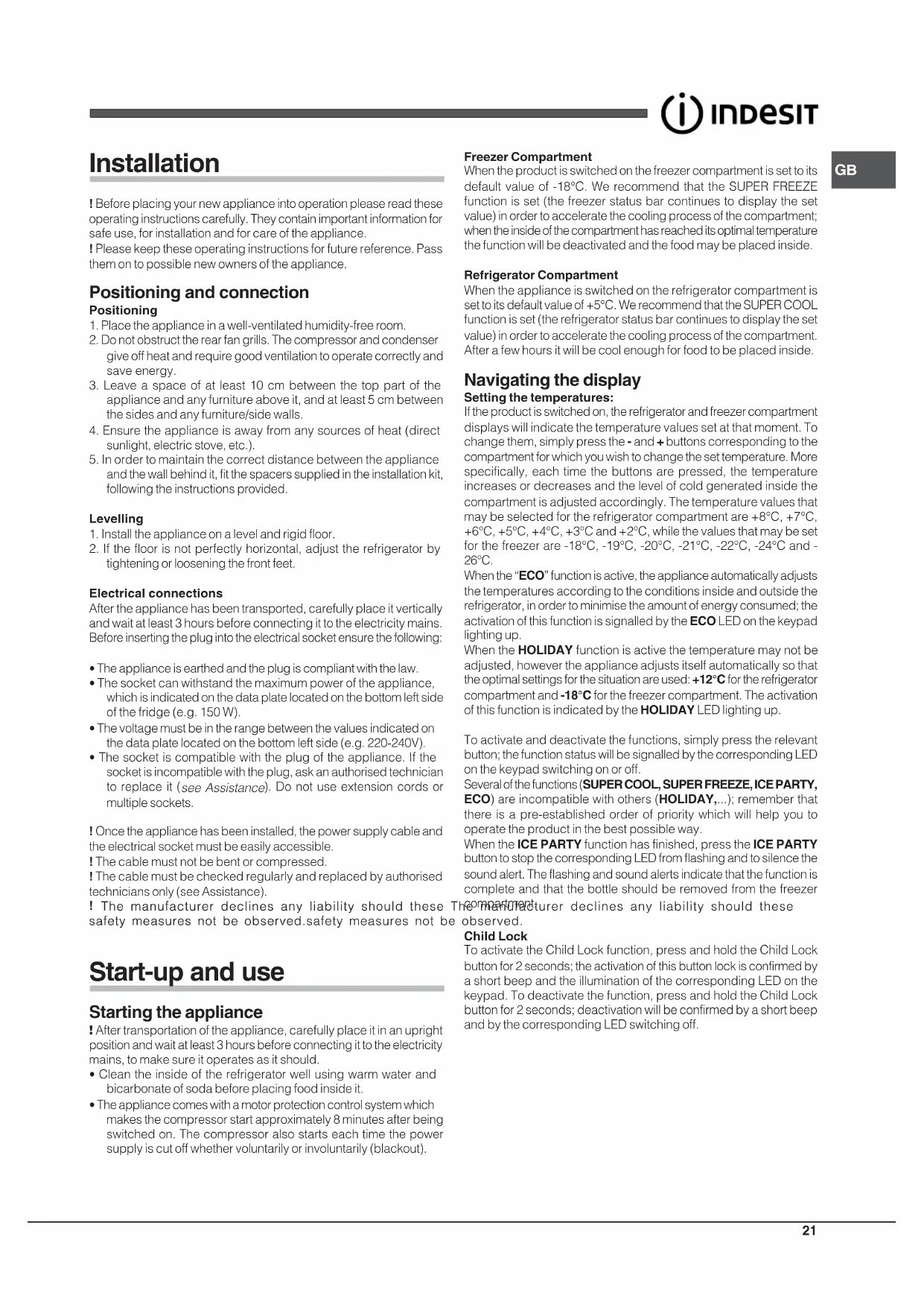 Installation ! Before placing your new appliance into operation please read theseoperating instructions carefully. They contain important information forsafe use, for installation and for care of the appliance.! Please keep these operating instructions for future reference. Passthem on to possible new owners of the appliance. Positioning and connection Positioning1. Place the appliance in a well-ventilated humidity-free room.2. Do not obstruct the rear fan grills. The compressor and condensergive off heat and require good ventilation to operate correctly andsave energy.3. Leave a space of at least 10 cm between the top part of theappliance and any furniture above it, and at least 5 cm betweenthe sides and any furniture/side walls.4. Ensure the appliance is away from any sources of heat (directsunlight, electric stove, etc.).5. In order to maintain the correct distance between the applianceand the wall behind it, fit the spacers supplied in the installation kit,following the instructions provided.Levelling1. Install the appliance on a level and rigid floor.2. If the floor is not perfectly horizontal, adjust the refrigerator bytightening or loosening the front feet.Electrical connectionsAfter the appliance has been transported, carefully place it verticallyand wait at least 3 hours before connecting it to the electricity mains.Before inserting the plug into the electrical socket ensure the following:• The appliance is earthed and the plug is compliant with the law.• The socket can withstand the maximum power of the appliance,which is indicated on the data plate located on the bottom left sideof the fridge (e.g. 150 W).• The voltage must be in the range between the values indicated onthe data plate located on the bottom left side (e.g. 220-240V).• The socket is compatible with the plug of the appliance. If thesocket is incompatible with the plug, ask an authorised technicianto replace it ( see Assistance ). Do not use extension cords ormultiple sockets.! Once the appliance has been installed, the power supply cable andthe electrical socket must be easily accessible.! The cable must not be bent or compressed.! The cable must be checked regularly and replaced by authorisedtechnicians only (see Assistance). ! The manufacturer declines any liability should these The manufacturer declines any liability should these The manufacturer declines any liability should these The manufacturer declines any liability should these The manufacturer declines any liability should thesesafety measures not be observed.safety measures not be observed.safety measures not be observed.safety measures not be observed.safety measures not be observed. Start-up and use