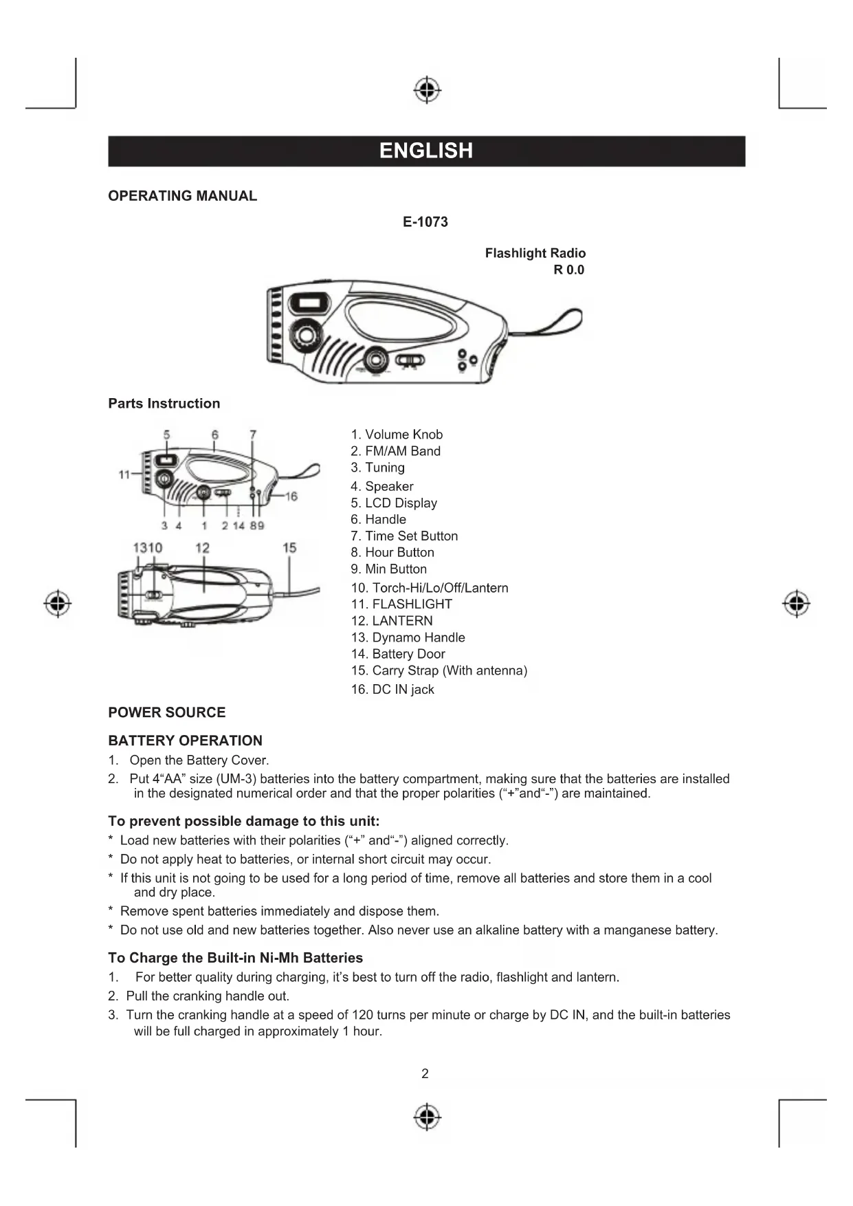 workingtimeforradioorashlightwilldependonthebatterylevelandthecrankingspeed. Whentheunitisfullycharged,theradiowillworkforabout3hoursata1/3volumelevel;theashlightwill work for approximately 1 hour; the lantern will work for about 1.5 hours; all functions used together and the batteries will be exhausted in approximately 1 hour. Caution Note