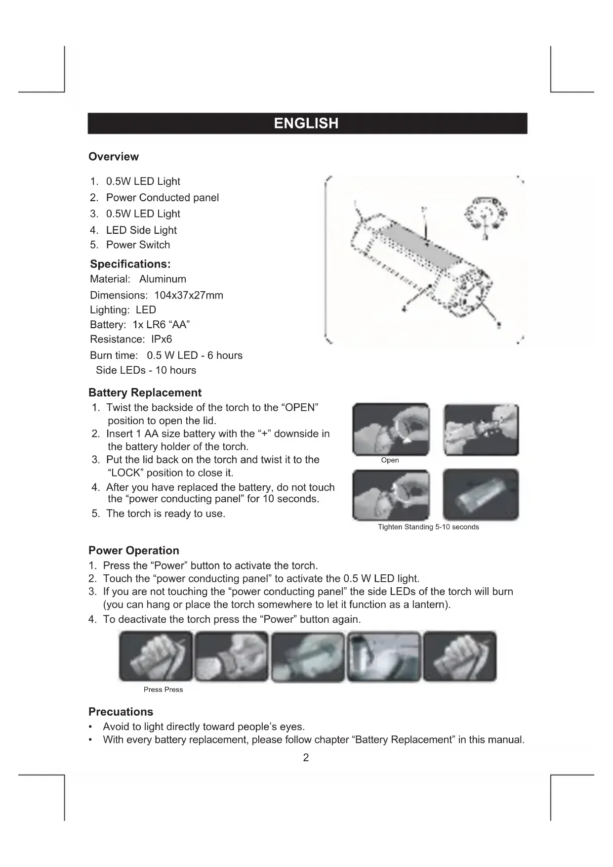 1. Press the “Power” button to activate the torch.