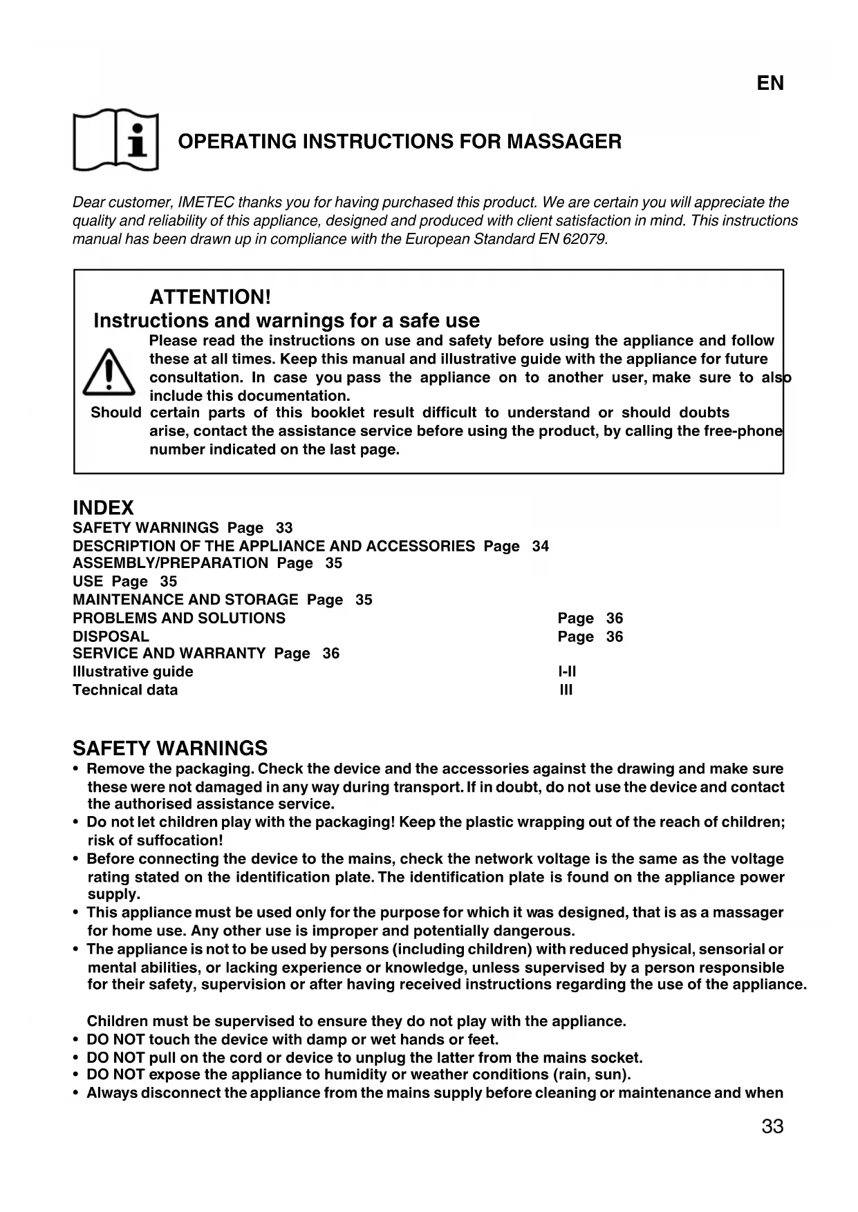 OPERATING INSTRUCTIONS FOR MASSAGER Dear customer, IMETEC thanks you for having purchased this product. We are certain you will appreciate the