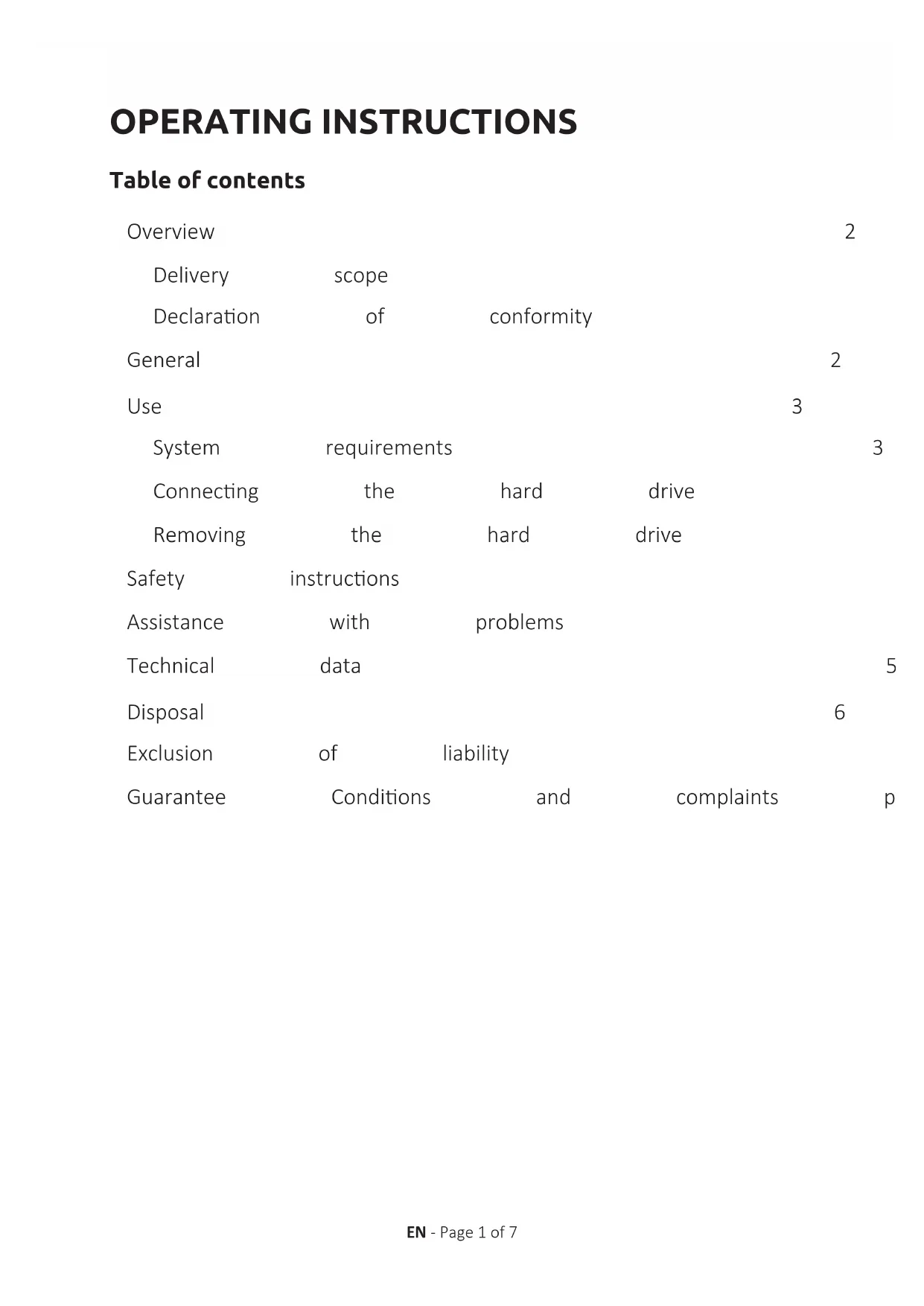 Service Center (Ihre RMA-Nr.) Kopernikusstraße 12-14 D-49377 Vechta Kontakt: Email (technischer Support): support@intenso-internaonal.de Email (RMA-Nummer): rma@intenso-internaonal.de Internet: www.intenso-internaonal.de Service Hotline: +49 (0) 900 –1 50 40 30 (0,39 € / min. aus dem deutschen Festnetz. Mobilfunkpreise können abweichen.) ReklamationsablaufOPERATING INSTRUCTIONS EN - Page 1 of 7 Table of contents Overview 2 Delivery scope 2 Declaraon of conformity 2 General 2 Use 3 System requirements 3 Connecng the hard drive 3 Removing the hard drive 3 Safety instrucons 4 Assistance with problems 5 Technical data 5 Disposal 6 Exclusion of liability 6 Guarantee Condions and complaints procedure 7EN - Page 2 of 7 Read these instruc ons carefully and please observe and heed all references made in these instruc ons to guarantee a long life and reliable use of the device. Please keep these instruc ons ready to hand and pass them on to other users of the device. About these instructions GENERAL Declaration of conformity The CE marking says that this product meets the requirements of all EU Direc ves applicable for this product. Delivery scope OVERVIEW The primary purpose of this external hard drive is the storage of data from PCs, Notebooks, Ultrabooks or MAC computers. This product is not intended for commercial use or for medical and special applica ons, where the failure of the product can cause injuries, mortali es or considerable material damages. In the case of use which does not correspond to the intended use, the liability expires. TThe opening, as well as conversion of the device and the use of addi onal devices and accessories, which are not approved by us, must be refrained from. Do not use the device under extreme ambient condi ons and observe the safety instruc ons. Non-observance of the informa on and safety instruc ons in these Instruc ons is deemed as non-observance of the intended use and leads to expiry of the liability and can lead to personal or material damage. Intended use