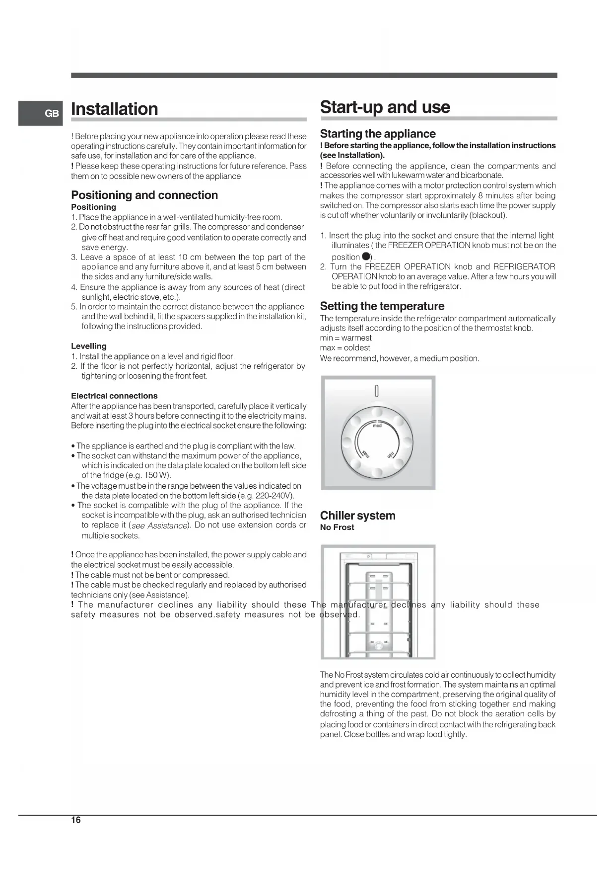 GB Installation ! Before placing your new appliance into operation please read theseoperating instructions carefully. They contain important information forsafe use, for installation and for care of the appliance.! Please keep these operating instructions for future reference. Passthem on to possible new owners of the appliance. Positioning and connection Positioning1. Place the appliance in a well-ventilated humidity-free room.2. Do not obstruct the rear fan grills. The compressor and condensergive off heat and require good ventilation to operate correctly andsave energy.3. Leave a space of at least 10 cm between the top part of theappliance and any furniture above it, and at least 5 cm betweenthe sides and any furniture/side walls.4. Ensure the appliance is away from any sources of heat (directsunlight, electric stove, etc.).5. In order to maintain the correct distance between the applianceand the wall behind it, fit the spacers supplied in the installation kit,following the instructions provided.Levelling1. Install the appliance on a level and rigid floor.2. If the floor is not perfectly horizontal, adjust the refrigerator bytightening or loosening the front feet.Electrical connectionsAfter the appliance has been transported, carefully place it verticallyand wait at least 3 hours before connecting it to the electricity mains.Before inserting the plug into the electrical socket ensure the following:• The appliance is earthed and the plug is compliant with the law.• The socket can withstand the maximum power of the appliance,which is indicated on the data plate located on the bottom left sideof the fridge (e.g. 150 W).• The voltage must be in the range between the values indicated onthe data plate located on the bottom left side (e.g. 220-240V).• The socket is compatible with the plug of the appliance. If thesocket is incompatible with the plug, ask an authorised technicianto replace it ( see Assistance ). Do not use extension cords ormultiple sockets.! Once the appliance has been installed, the power supply cable andthe electrical socket must be easily accessible.! The cable must not be bent or compressed.! The cable must be checked regularly and replaced by authorisedtechnicians only (see Assistance). ! The manufacturer declines any liability should these The manufacturer declines any liability should these The manufacturer declines any liability should these The manufacturer declines any liability should these The manufacturer declines any liability should thesesafety measures not be observed.safety measures not be observed.safety measures not be observed.safety measures not be observed.safety measures not be observed. Start-up and use